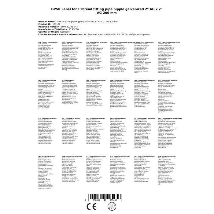 Raccord fileté Nipple de tuyau galvanisé 2" AG x 2" AG 200 mm Les nipples de tuyau sont des pièces de raccordement de tuyaux qui servent généralement à la transmission de liquides et de gaz. Les domaines d'application sont extrêmement variés : de l'installation sanitaire, de chauffage et de gaz aux systèmes de réfrigération et de climatisation, systèmes de sprinklers et d'extinction de gaz, construction d'installations industrielles, construction de machines, construction de stations-service, construction de machines à papier et d'imprimerie jusqu'à la construction de véhicules utilitaires. Les raccords filetés ne sont pas auto-étanches. Pour l'étanchéité, il convient d'utiliser par exemple du ruban téflon ou du chanvre. Données techniques: Matériau : AcierTraitement de surface : GalvaniséPression de service max. 20 barsTempérature de service max. 180°C IG = Filetage intérieurAG= Filetage extérieur" = PouceExemple : 1" IG x 2"AG = 1 pouce filetage intérieur x 2 pouces filetage extérieur Type de filetage: Les filetages de tous les raccords de tuyauterie sont fabriqués selon les normes courantes ISO 7-1/EN 10226-1 (filetage intérieur et extérieur) ainsi que ISO 228-1 (écrous de raccordement). Les filetages extérieurs sont coniques. Les filetages intérieurs sont parallèles/cylindriques. Tous les filetages sont indiqués en pouces par défaut. Les filetages sont étanchés avec un matériau d'étanchéité fileté approprié tel que du ruban d'étanchéité PTFE ou du chanvre d'étanchéité fileté. Filetage de tuyau Whitworth pour tuyaux filetés et raccordsFiletageen poucesFiletage extérieuren mmFiletage intérieur / Diamètre de noyauen mmFiletspar poucePasen mmLongueur du filetage(par filetage)en mm 1/4"13,15711,445191,33712 3/8"16,66214,95191,33712 1/2"20,95518,631141,81414 3/4"26,44124,117141,81416 1"33,24930,291112,30918 1 1/4"41,9138,952112,30920 1 1/2"47,80344,845112,30922 2"59,61456,656112,30924 Le vendeur confirme que ses produits sont conformes à toutes les lois applicables et ne sont proposés que s'ils sont conformes aux politiques de Joom et aux lois européennes sur la sécurité et la conformité des produits.