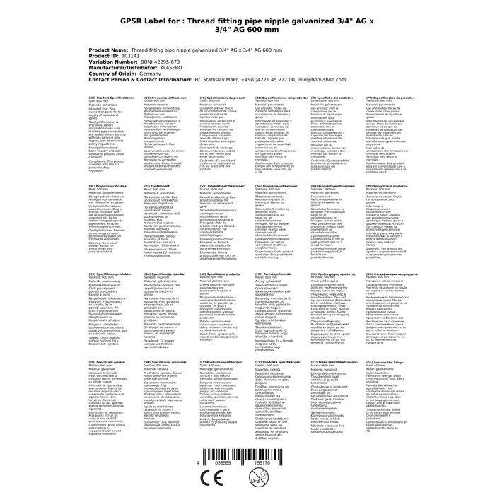 Ниппель резьбовой оцинкованный 3/4" НР x 3/4" НР 600 ммТрубные ниппели - это соединительные элементы трубопроводов, которые обычно используются для передачи жидкостей и газов. Области применения чрезвычайно разнообразны : от санитарно-технического, отопительного и газового оборудования до холодильного и климатического оборудования, включая спринклерные и газовые системы пожаротушения, строительство промышленных установок, машиностроение, строительство автозаправочных станций, строительство бумагоделательных и печатных машин до строительства коммерческих транспортных средств. Резьбовые соединения не являются самогерметизирующимися. Для герметизации следует использовать, например, тефлоновую ленту или паклю.Технические данные:Материал : СтальОбработка поверхности : ОцинкованныйМаксимальное рабочее давление. 20 барМаксимальная рабочая температура. 180°C IG = Внутренняя резьбаAG = Наружная резьба" = ДюймПример : 1" IG x 2"AG = 1 дюйм внутренняя резьба x 2 дюйма наружная резьбаТип резьбы:Резьбы всех трубных фитингов изготовлены по действующим стандартам ISO 7-1/EN 10226-1 (внутренняя и наружная резьба) а также ISO 228-1 (соединительные гайки). Наружные резьбы конические. Внутренние резьбы параллельны. Все резьбы указаны в дюймах по умолчанию. Резьбовые соединения герметизируются подходящим резьбовым герметизирующим материалом, таким как лента PTFE или резьбовая пакля.. Трубная резьба Витворта для резьбовых труб и фитинговДюймовая резьбаНаружная резьба в ммВнутренняя резьба / диаметр сердечника в ммЧисло ниток на дюймШаг в ммДлина резьбы(по резьбе)en мм 1/4"13,15711,445191,33712 3/8"16,66214,95191,33712 1/2"20,95518,631141,81414 3/4"26,44124,117141,81416 1"33,24930,291112,30918 1 1/4"41,9138,952112,30920 1 1/2"47,80344,845112,30922 2"59,61456,656112,30924 Продавец подтверждает, что его продукция соответствует всем применимым законам и предлагается только в том случае, если она соответствует политике Joom и европейским законам о безопасности и соответствии продукции.
