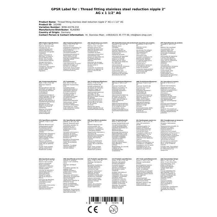 Réducteur Fileté Inox V4A 2" x 1 1/2", Raccord Plomberie