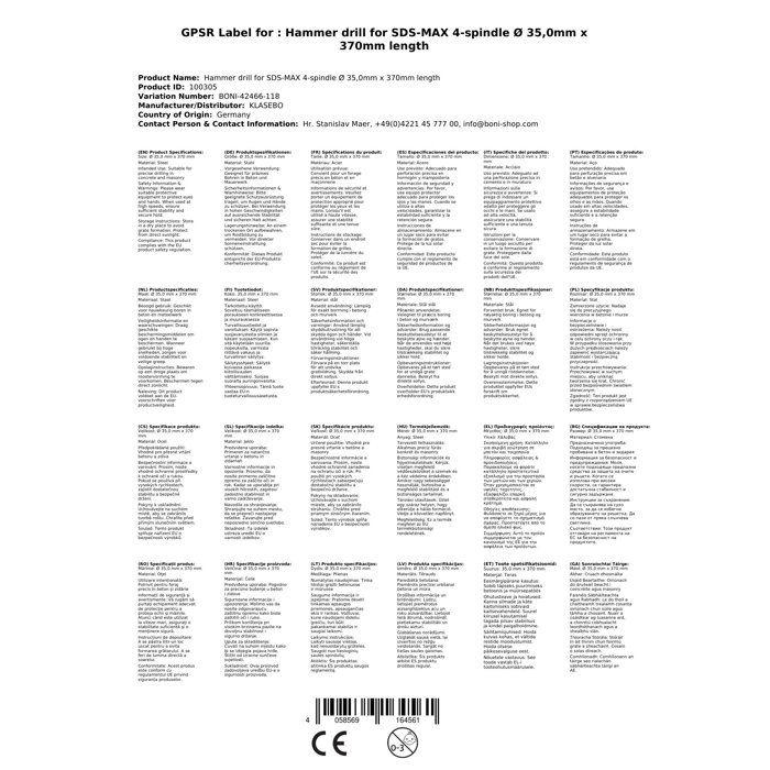 Сверло SDS Max 35 мм, 4 режущие кромки, 370 мм для бетона