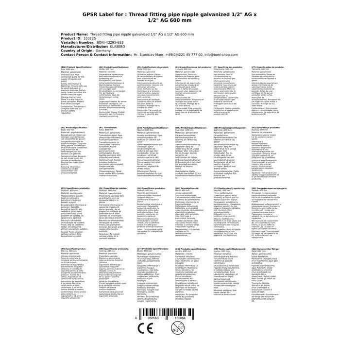 Raccord fileté Nipple de tuyau galvanisé 1/2" AG x 1/2" AG 600 mmLes nipples de tuyau sont des pièces de raccordement de tuyaux qui servent généralement à la transmission de liquides et de gaz. Les domaines d'application sont extrêmement variés : de l'installation sanitaire, de chauffage et de gaz aux systèmes de réfrigération et de climatisation, systèmes de sprinklers et d'extinction de gaz, construction d'installations industrielles, construction de machines, construction de stations-service, construction de machines à papier et d'imprimerie jusqu'à la construction de véhicules utilitaires.Les raccords filetés ne sont pas auto-étanches. Pour l'étanchéité, il convient d'utiliser par exemple du ruban Téflon ou du chanvre.Données techniques:Matériau : AcierTraitement de surface : GalvaniséPression de service max. 20 barTempérature de service max. 180°C IG = Filetage intérieurAG= Filetage extérieur" = PouceExemple : 1" IG x 2"AG = 1 pouce filetage intérieur x 2 pouces filetage extérieurType de filetage:Les filetages de tous les raccords de tuyaux sont fabriqués selon les normes courantes ISO 7-1/EN 10226-1 (filetage intérieur et extérieur) ainsi que ISO 228-1 (écrous de raccordement). Les filetages extérieurs sont coniques. Les filetages intérieurs sont parallèles. Tous les filetages sont indiqués en pouces par défaut. Les filetages sont étanchéifiés avec un matériau d'étanchéité fileté approprié tel que le ruban d'étanchéité PTFE ou le chanvre d'étanchéité fileté. Filetage de tuyau Whitworth pour tuyaux filetés et raccordsFiletageen poucesFiletage extérieuren mmFiletage intérieur / Diamètre de noyauen mmFiletspar poucePasen mmLongueur de filetage(par filetage)en mm 1/4"13,15711,445191,33712 3/8"16,66214,95191,33712 1/2"20,95518,631141,81414 3/4"26,44124,117141,81416 1"33,24930,291112,30918 1 1/4"41,9138,952112,30920 1 1/2"47,80344,845112,30922 2"59,61456,656112,30924 Le vendeur confirme que ses produits sont conformes à toutes les lois applicables et ne sont proposés que s'ils sont conformes aux politiques de Joom et aux lois européennes sur la sécurité et la conformité des produits.