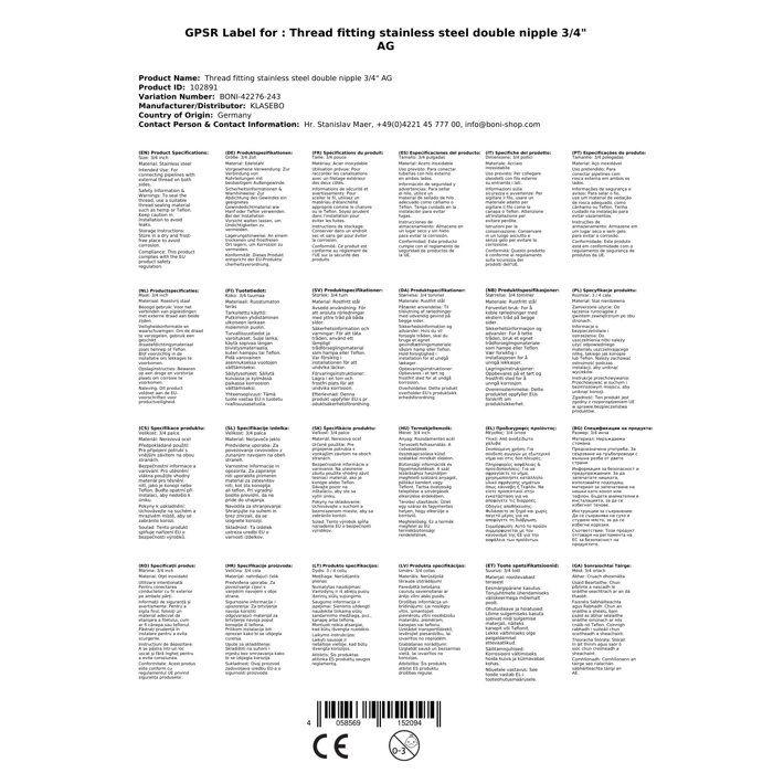Raccord Fileté Inox 3/4 Pouce: Double Mamelon en Acier V4A