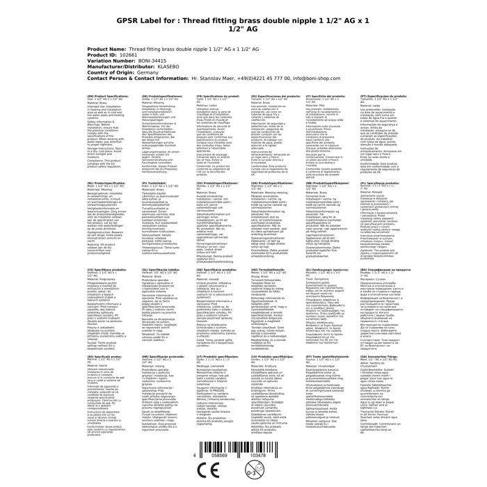 Double Mamelon Laiton 1 1/2 Pouce, Raccord Fileté