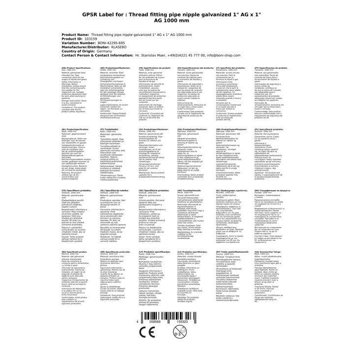 Raccord fileté Nipple de tuyau galvanisé 1" AG x 1" AG 1000 mmLes nipples de tuyau sont des pièces de raccordement de tuyaux qui servent généralement à la transmission de liquides et de gaz. Les domaines d'application sont extrêmement variés : de l'installation sanitaire, de chauffage et de gaz aux systèmes de réfrigération et de climatisation, systèmes de sprinklers et d'extinction de gaz, construction d'installations industrielles, construction de machines, construction de stations-service, construction de machines à papier et d'imprimerie jusqu'à la construction de véhicules utilitaires.Les raccords filetés ne sont pas auto-étanches. Pour l'étanchéité, il convient d'utiliser par exemple du ruban téflon ou du chanvre.Données techniques:Matériau : AcierTraitement de surface : GalvaniséPression de service max. 20 barTempérature de service max. 180°C IG = Filetage intérieurAG= Filetage extérieur" = PouceExemple : 1" IG x 2"AG = 1 pouce filetage intérieur x 2 pouces filetage extérieurType de filetage:Les filetages de tous les raccords de tuyaux sont fabriqués selon les normes courantes ISO 7-1/EN 10226-1 (filetages intérieurs et extérieurs) ainsi que ISO 228-1 (écrous de raccordement). Les filetages extérieurs sont coniques. Les filetages intérieurs sont parallèles. Tous les filetages sont indiqués en pouces. Les filetages sont étanchéifiés avec un matériau d'étanchéité approprié tel que du ruban d'étanchéité PTFE ou du chanvre d'étanchéité. Filetage de tuyau Whitworth pour tuyaux filetés et raccordsFiletageen poucesFiletage extérieuren mmFiletage intérieur / diamètre de noyauen mmFiletspar poucePasen mmLongueur du filetage(par filetage)en mm 1/4"13,15711,445191,33712 3/8"16,66214,95191,33712 1/2"20,95518,631141,81414 3/4"26,44124,117141,81416 1"33,24930,291112,30918 1 1/4"41,9138,952112,30920 1 1/2"47,80344,845112,30922 2"59,61456,656112,30924 Le vendeur confirme que ses produits sont conformes à toutes les lois applicables et ne sont proposés que s'ils sont conformes aux politiques de Joom et aux lois européennes sur la sécurité et la conformité des produits.