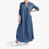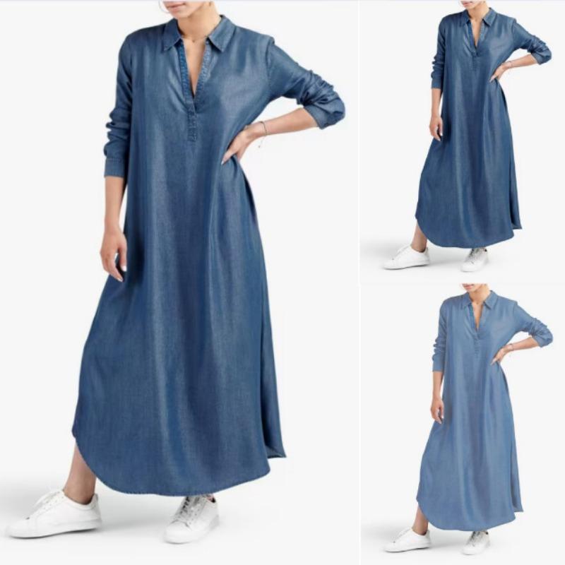 Платье макси из однотонного денима больших размеров: Платье А-силуэта с V-образным вырезом и длинными рукавами для женщин, повседневный, удобный, повседневный, шикарный наряд