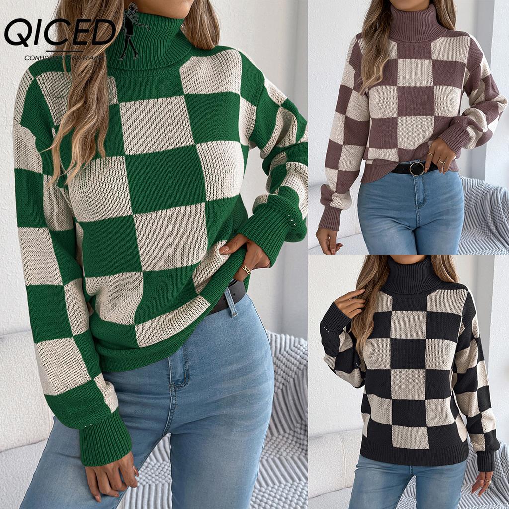 QICED Осень и Зима Повседневный Свитер с высоким воротником, контрастной расцветки, в клетку, с рукавами-фонариками, Женская одежда