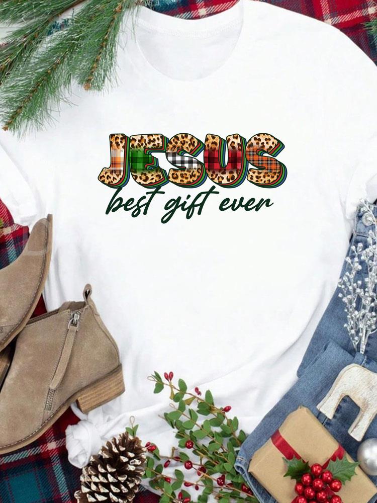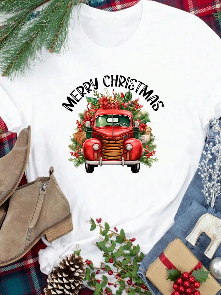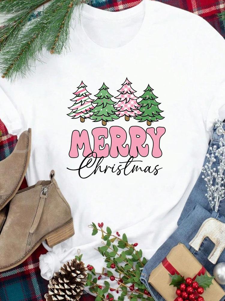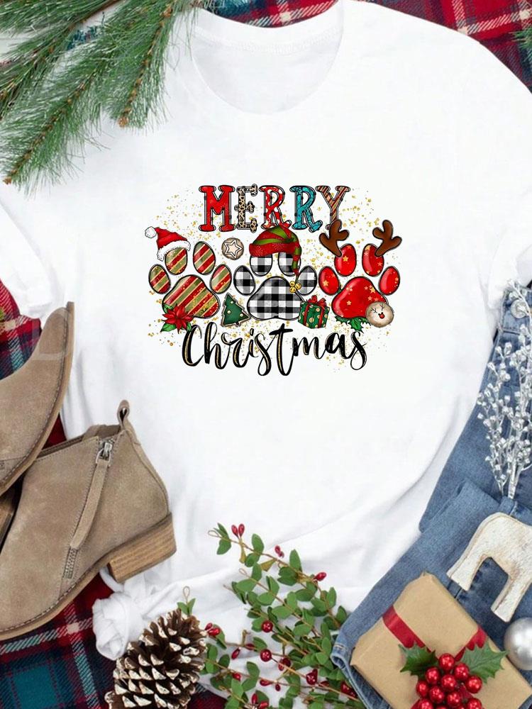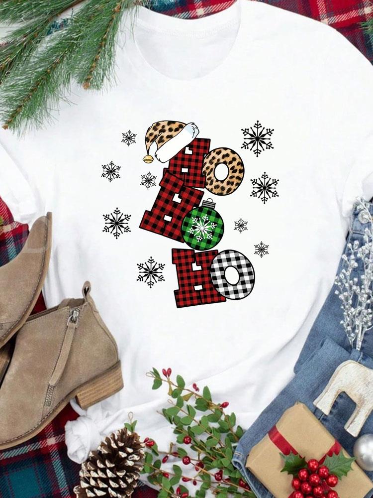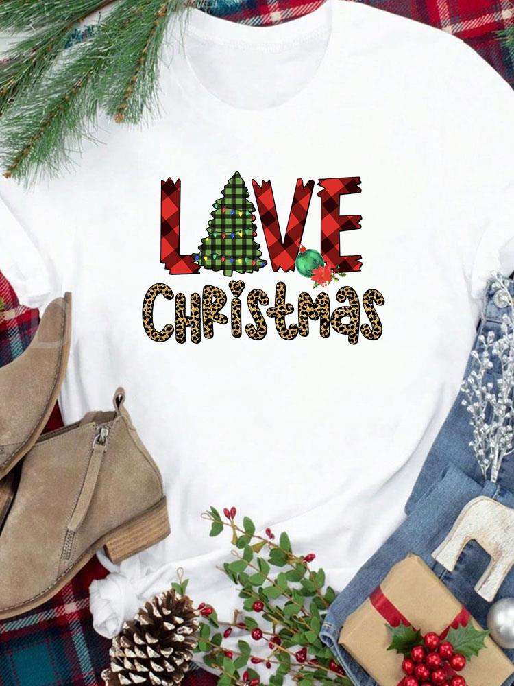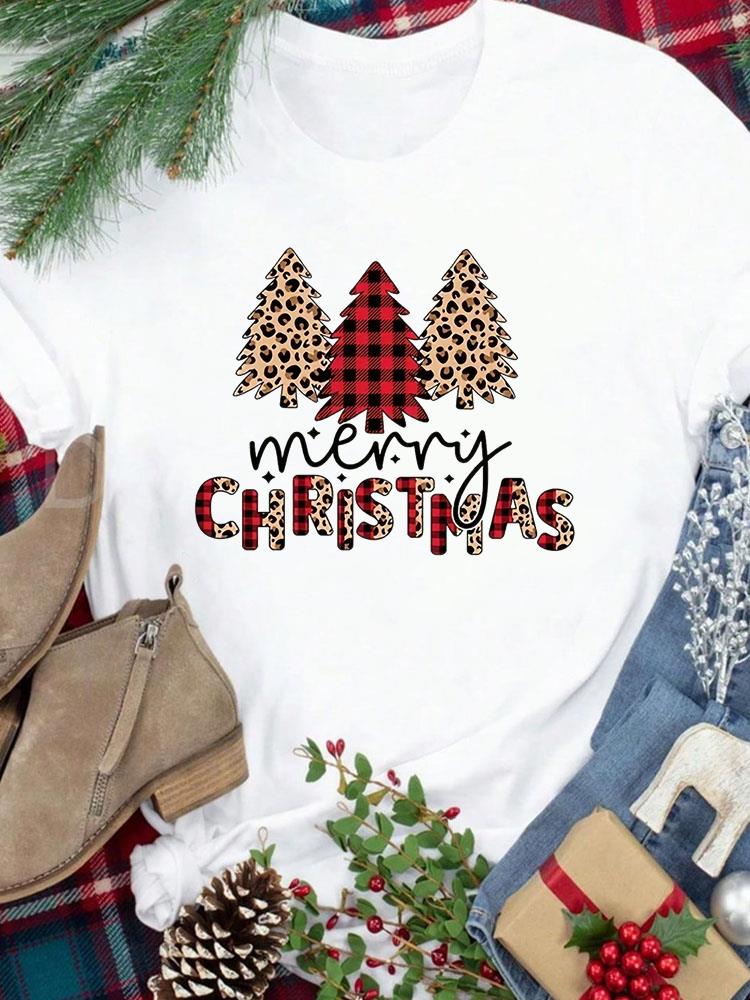 (Азиатский размер) Футболка Новогодний праздник Счастливого Рождества Топ фестиваль Повседневный леопардовый стиль милый Женский принт Леди Короткий рукав Модные графические футболки