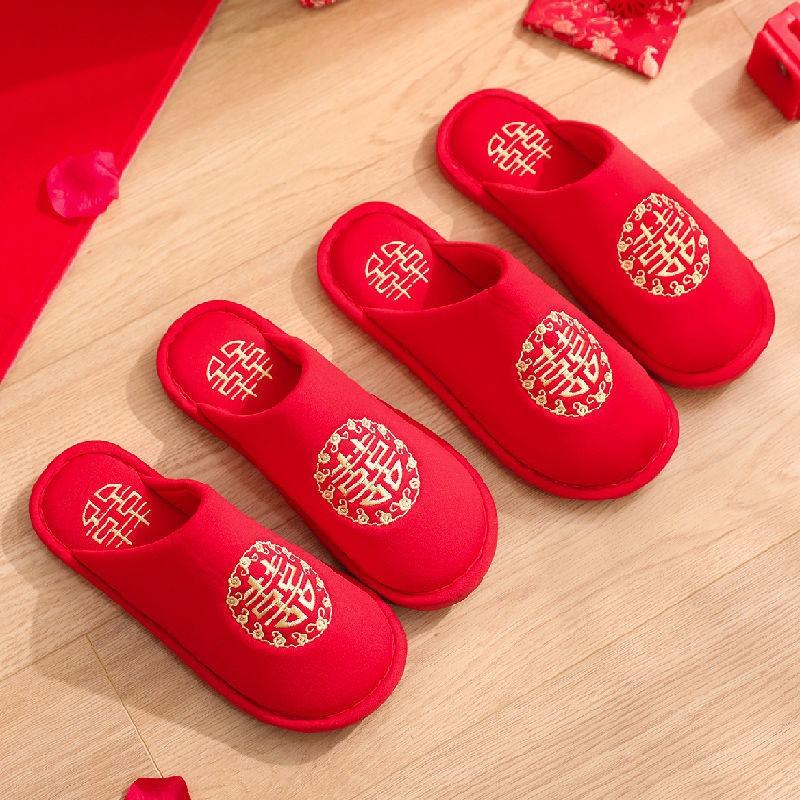 Свадебные хлопковые тапочки женские зимние домашние комнатные свадебные теплые плюшевые нескользящие с мягкой подошвой праздничные большие красные парные хлопковые туфли