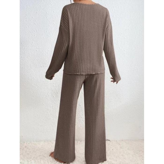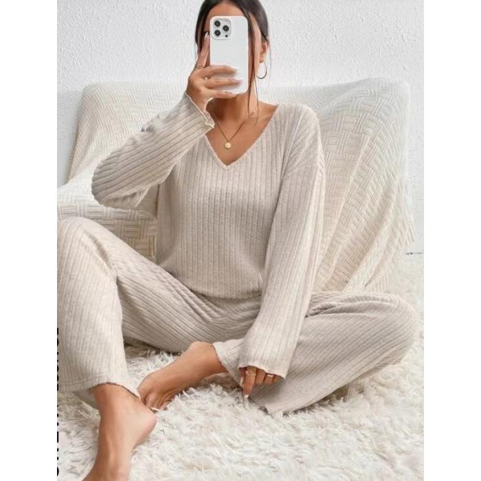 Свободный повседневный комплект из 2 предметов: топ с V-образным вырезом и длинными рукавами и широкие брюки из мягкой ворсистой ткани