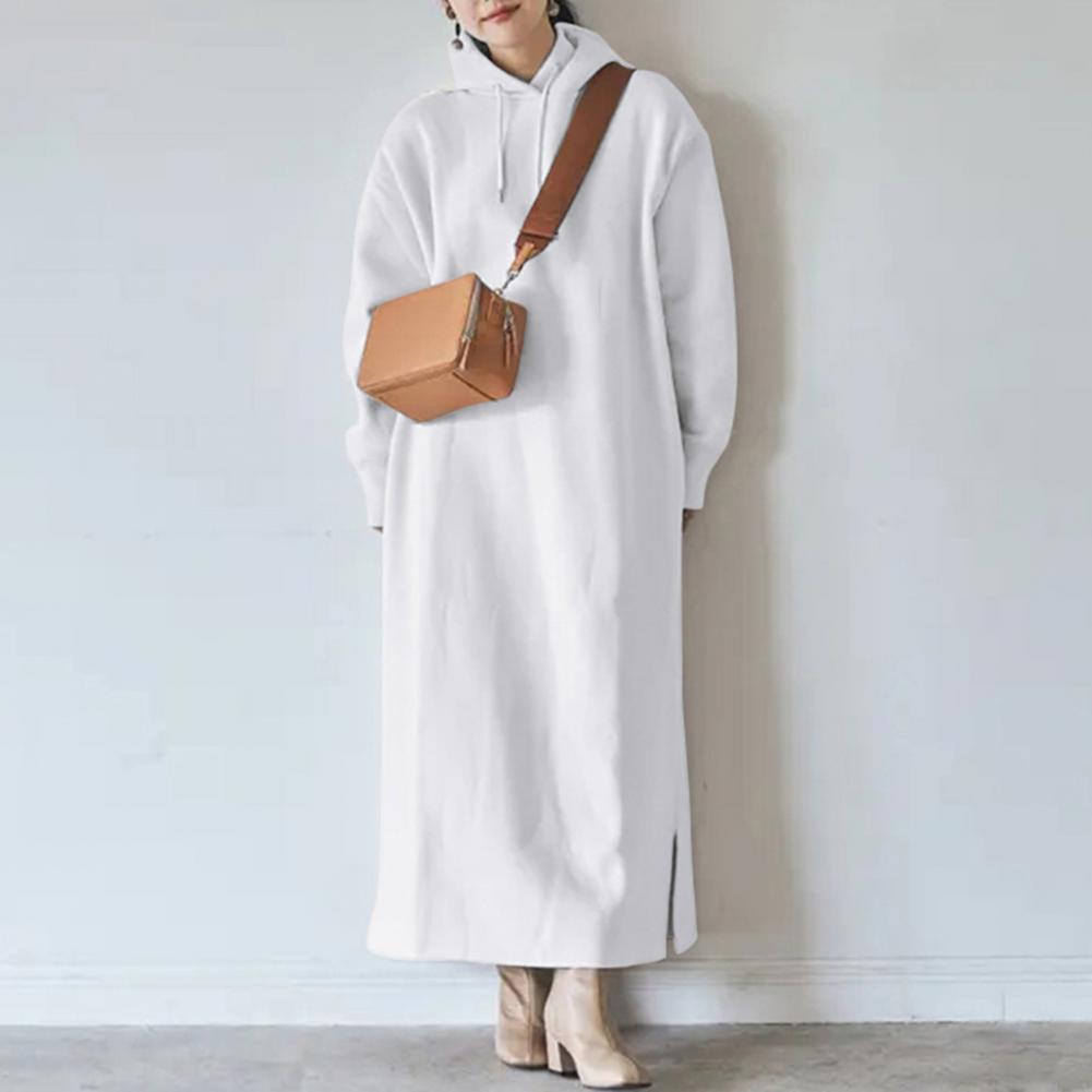 Женское платье-свитшот с кулиской, длинным рукавом и разрезом по боковому шву, пуловер, утолщенная флисовая подкладка, макси-платье с капюшоном