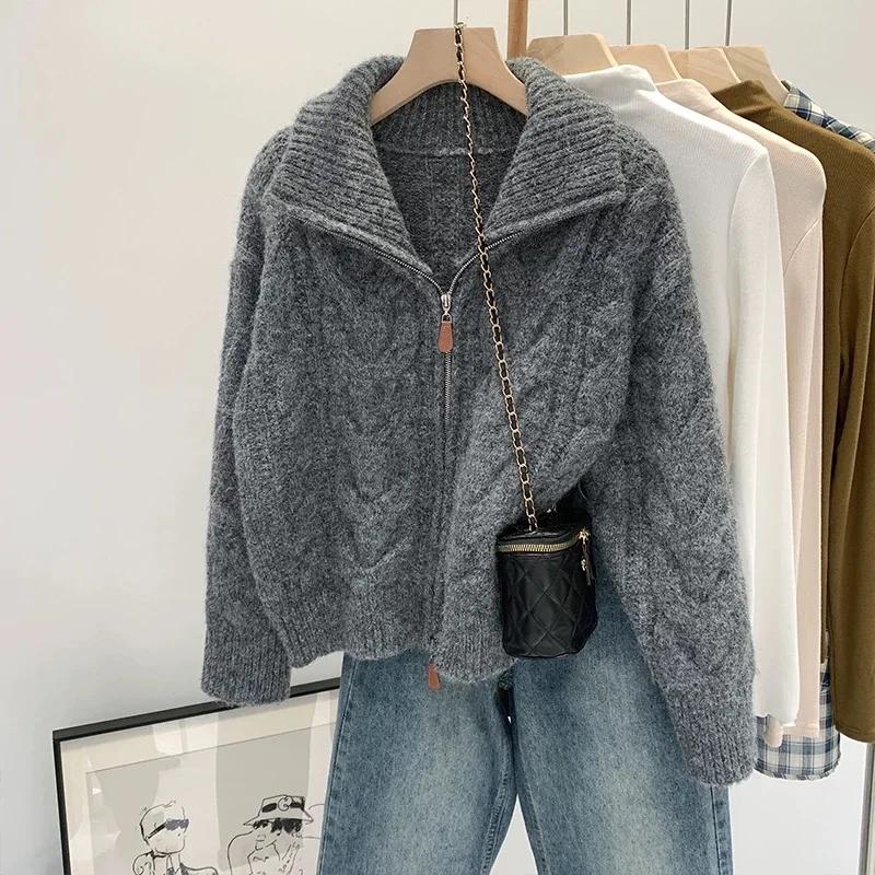 Однотонный свитер на двойной молнии с отложным воротником, женский осенне-зимний свободный вязаный кардиган, женский топ
