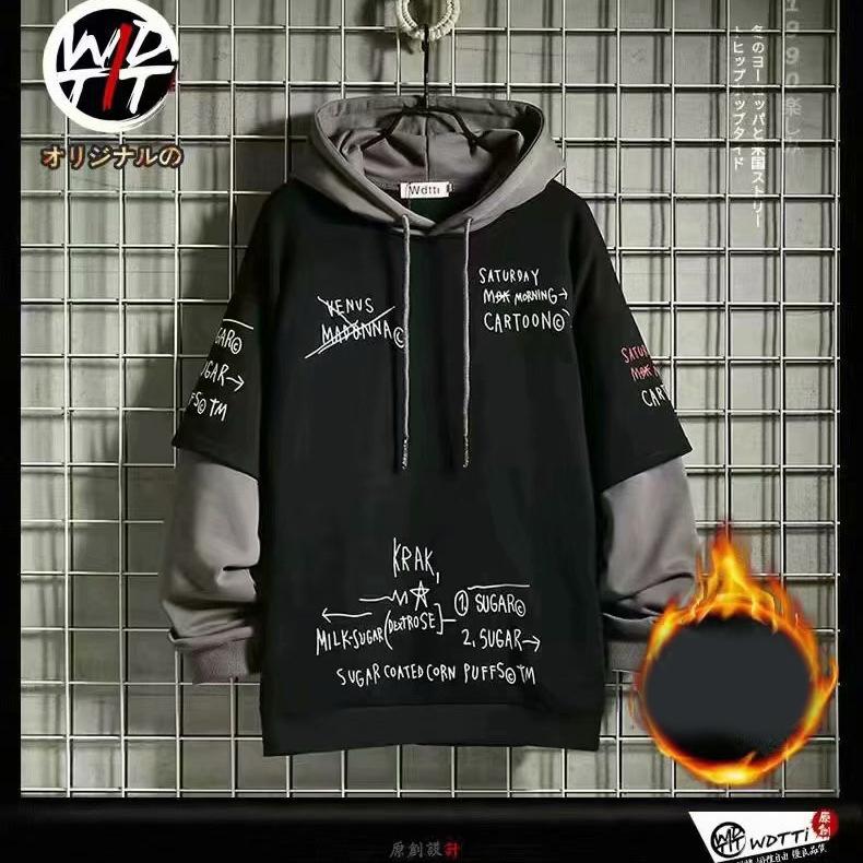 Весна Осень Мужской свитер Ретро Имитация Двойки Капюшон Корейский Хип-Хоп Принт Толстовка Свободный Худи Мужская Флисовая Утепленная Куртка