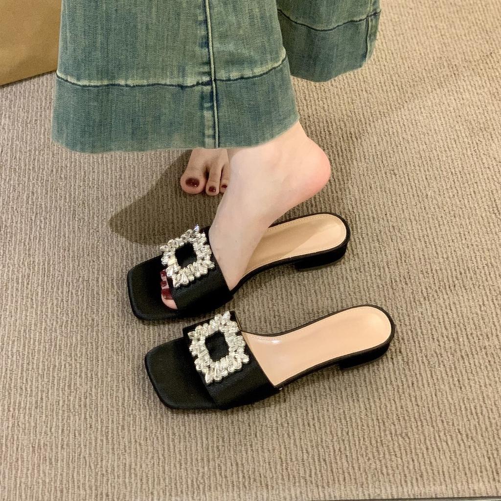 French thick heel silver temperament square buckle rhinestone one-word cool slippers women's shoes wear 2025 summer vacation sandals