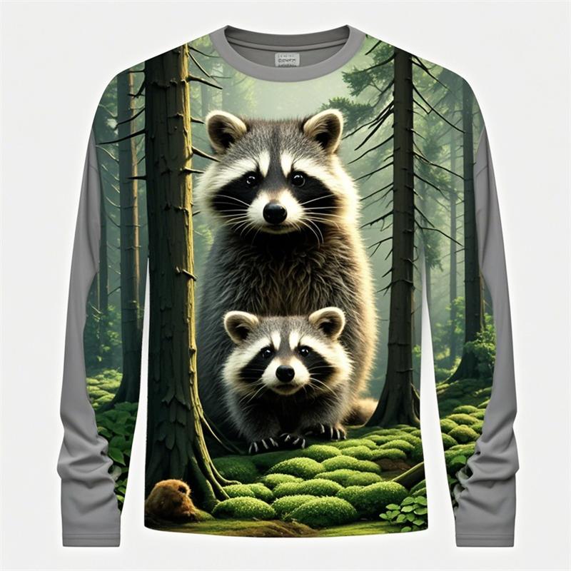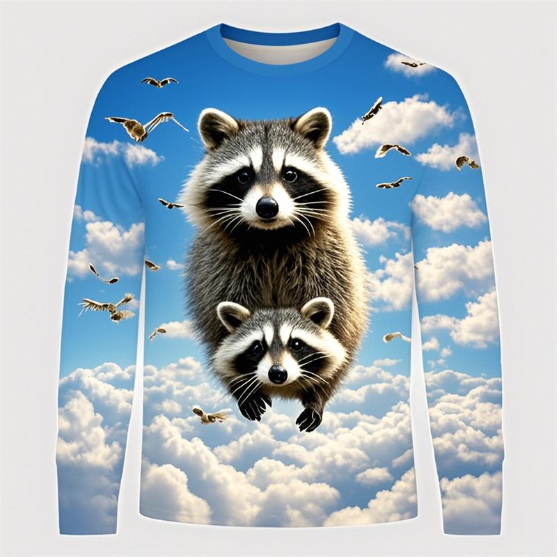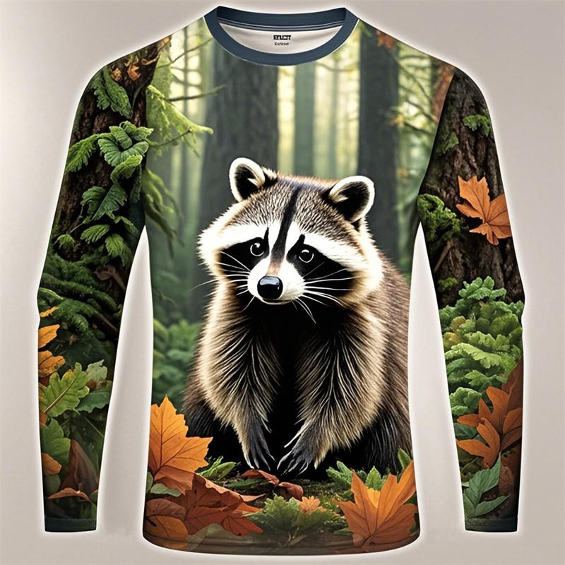 3D Принт Милый Енот Графическая Футболка Для Мужчин Забавный Анималистичный Узор Длинный Рукав Круглый Вырез Свободные Дышащие Удобные Мужские Топы