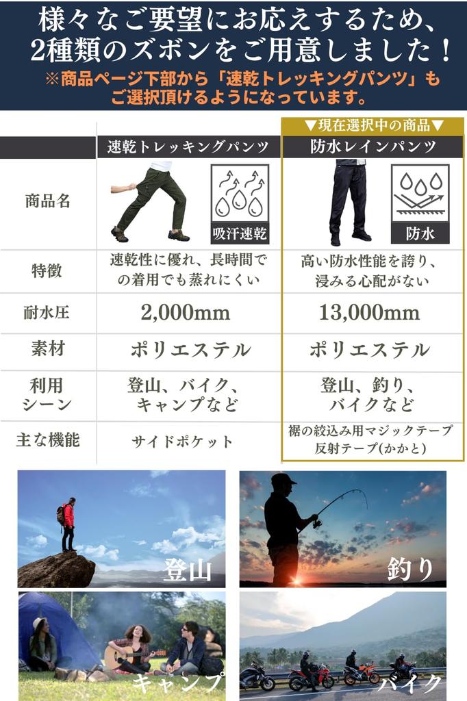 ✅;[Выберите один из двух типов брюк] Мы предлагаем два типа брюк на выбор, чтобы удовлетворить ваши потребности! Если для вас в приоритете быстросохнущие свойства и комфорт, выбирайте «Треккинговые брюки с быстрой сушкой». Если для вас в приоритете водонепроницаемость, выбирайте «Водонепроницаемые дождевые брюки». В настоящее время вы просматриваете страницу для комплекта «Водонепроницаемые дождевые брюки». Вы можете выбрать комплект «Быстросохнущие треккинговые брюки» внизу этой страницы.