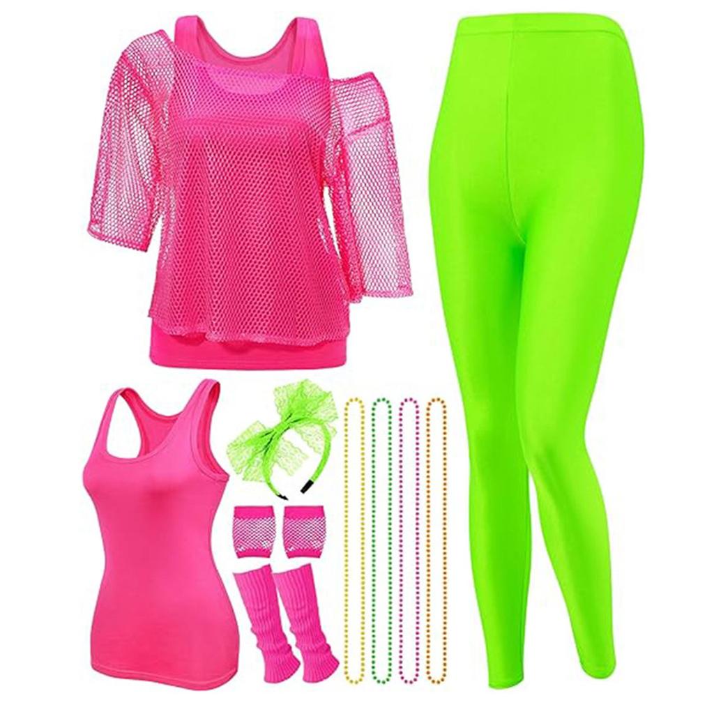 12 шт. Костюмы 80-х Аксессуары для женщин Вечеринка Сетка Футболка Леггинсы Жилет Повязка на голову Ожерелье Перчатки Гетры