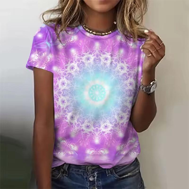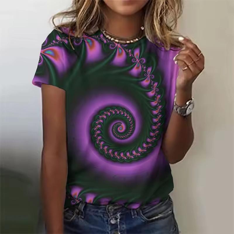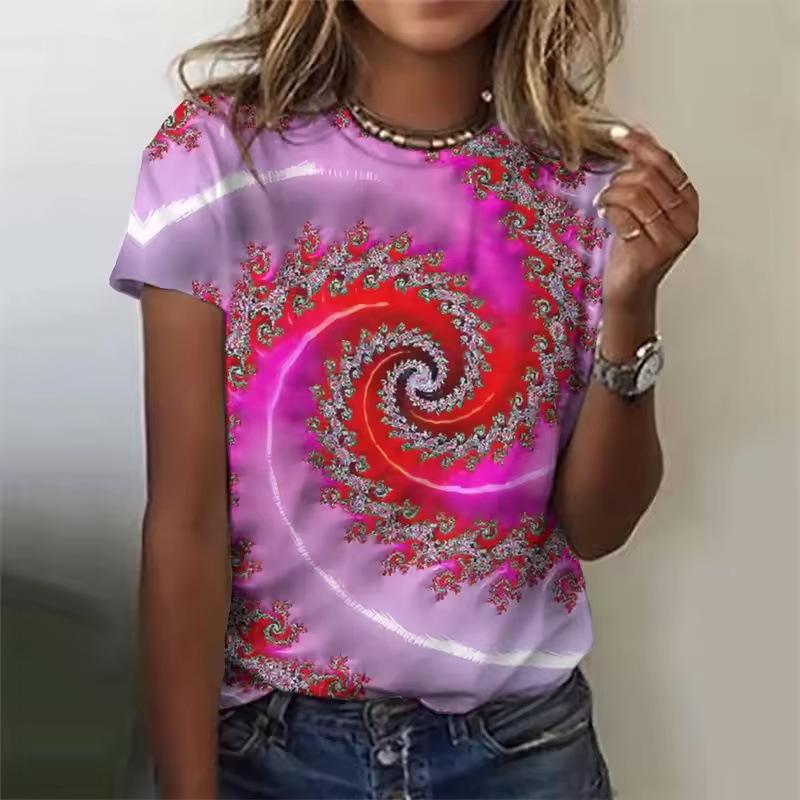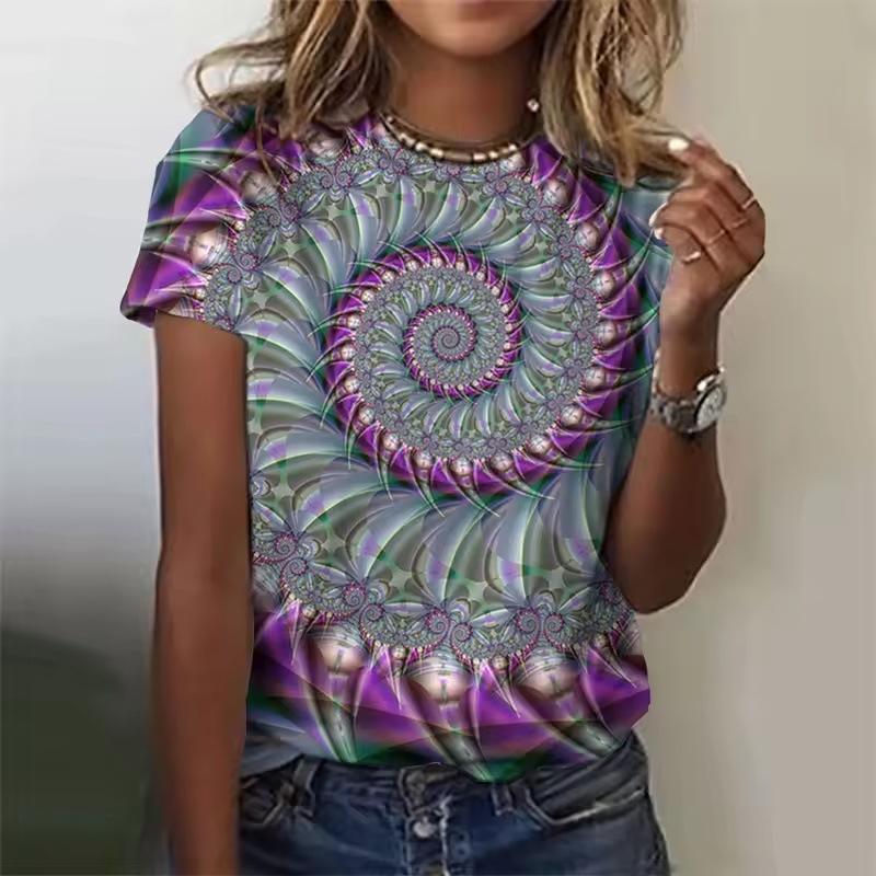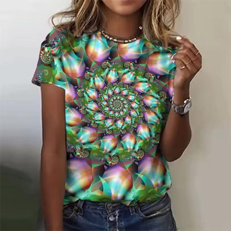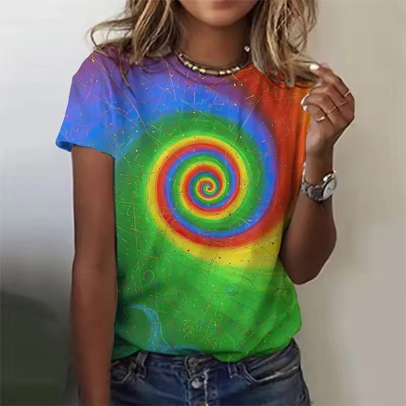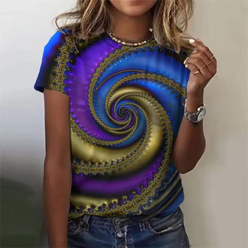 Футболки с 3D-принтом, цветным вращающимся узором, летние, ретро, свободные, с круглым вырезом, с коротким рукавом, женские