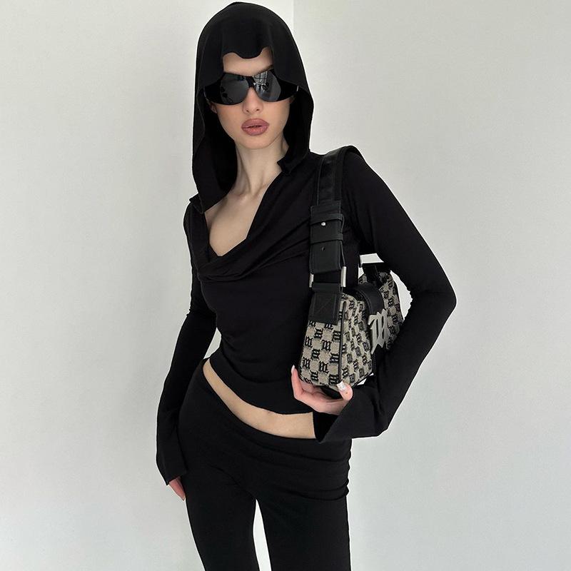 Y2K Black Folds Crop Top Hooded Full Sleeve T Shirt Women Punk Gothic Fashion Autumn Korean Pullovers Streetwear