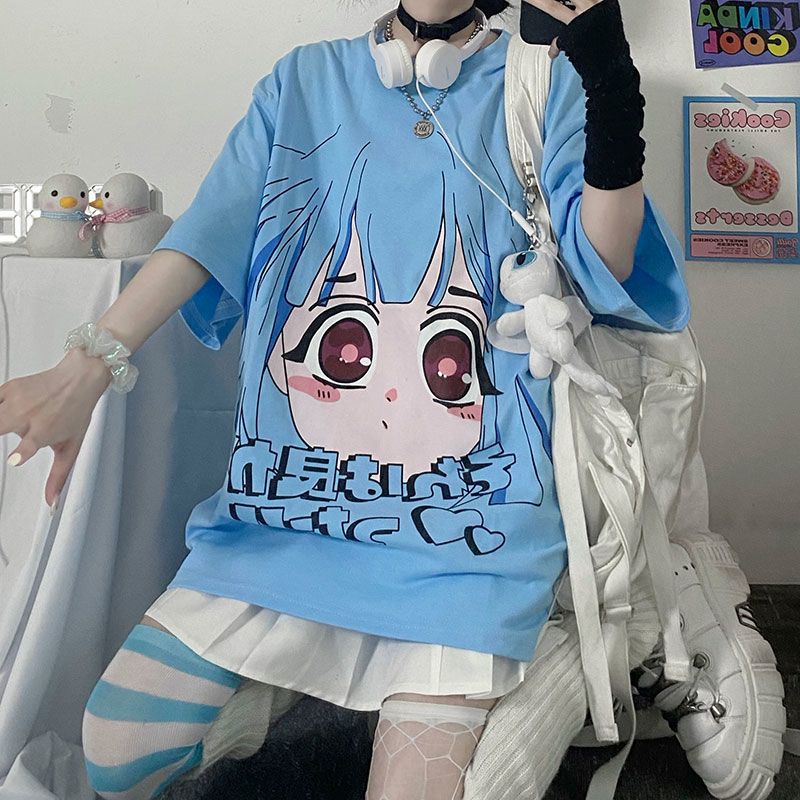 Футболка с принтом аниме для девушек из Японии, летняя синяя, симпатичная, Y2k, женские мешковатые вещи, двухмерная уличная одежда, кавайные футболки