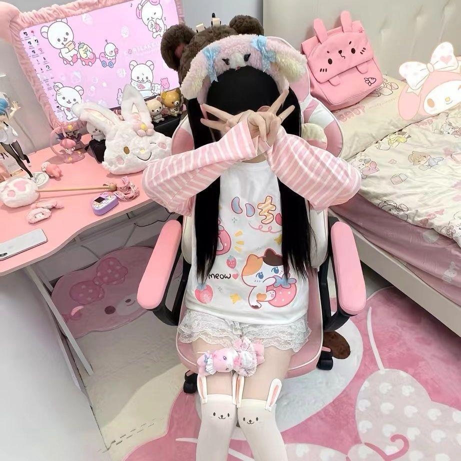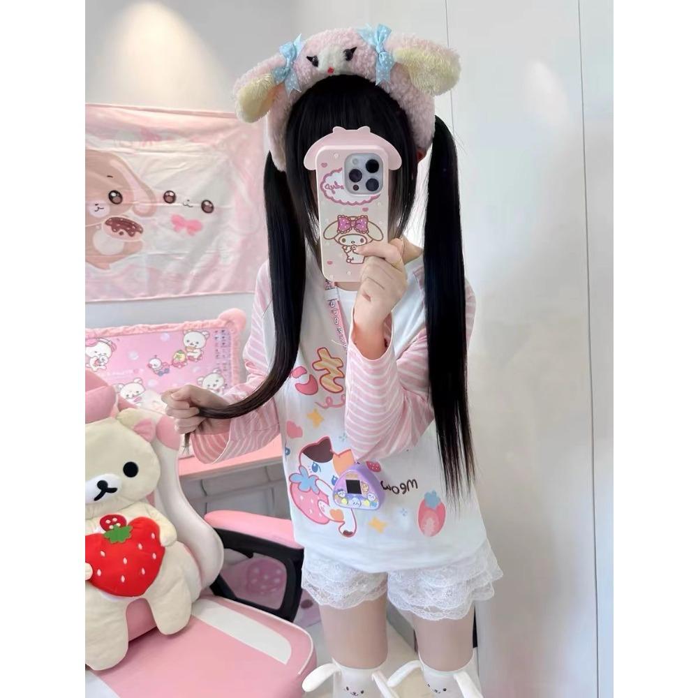 Уличная одежда с принтом в виде фей и мультфильмов Футболки в стиле Лолиты Осенние топы с круглым вырезом в винтажном стиле в полоску Для женщин Эстетика 2000 года Тонкие футболки Harajuku