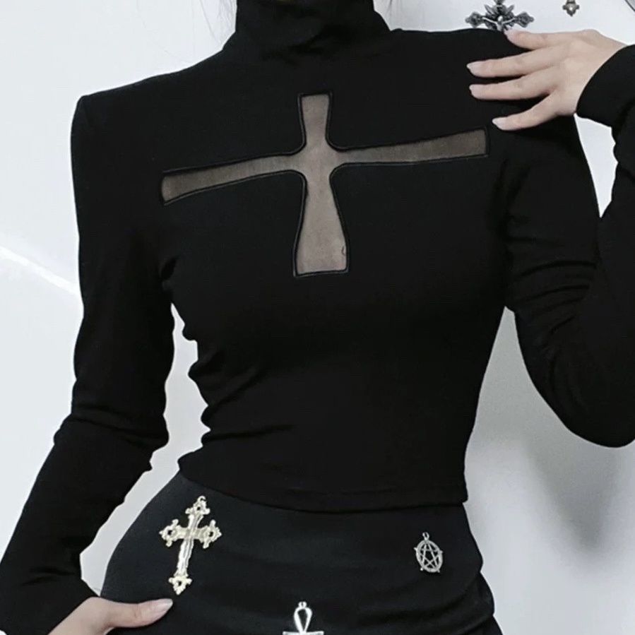 Готический темный крест полые длинные рукава топ Harajuku Y2K винтажный панк сексуальный перспектива модный стиль тонкий женский топ