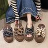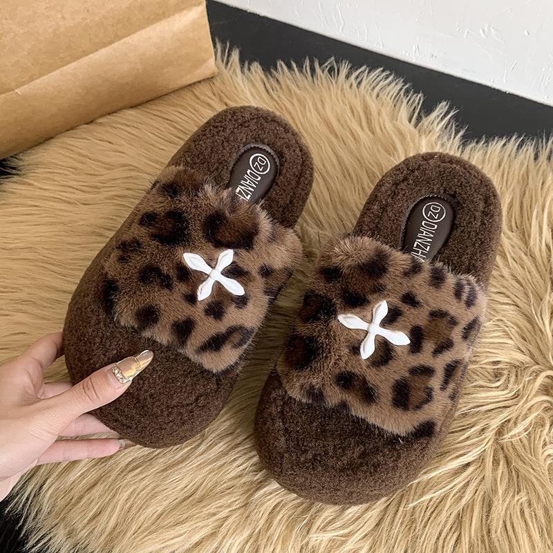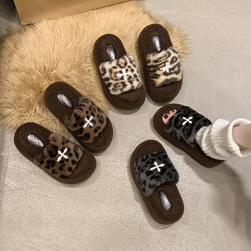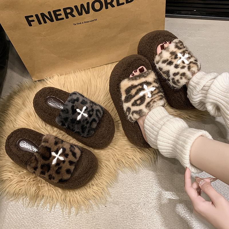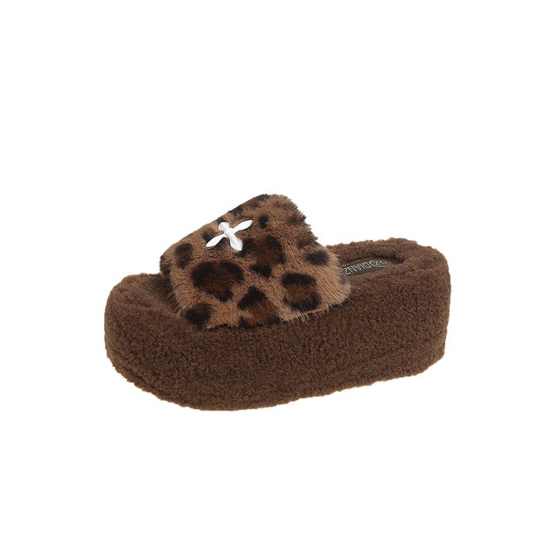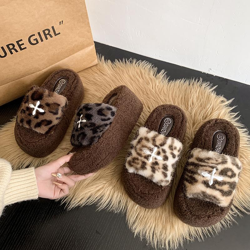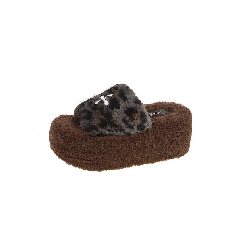 2025 осень и зима новые корейские тапочки на танкетке, женские, пушистые, на толстой подошве, на высоком каблуке, с леопардовым принтом, с открытым носком, хлопковые тапочки