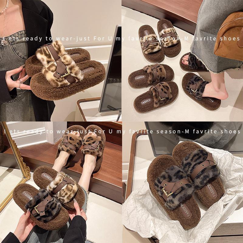 Muffin thick-soled fluffy slippers for women's outer wear 2025 autumn and winter new niche leopard print belt buckle versatile cotton slippers