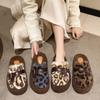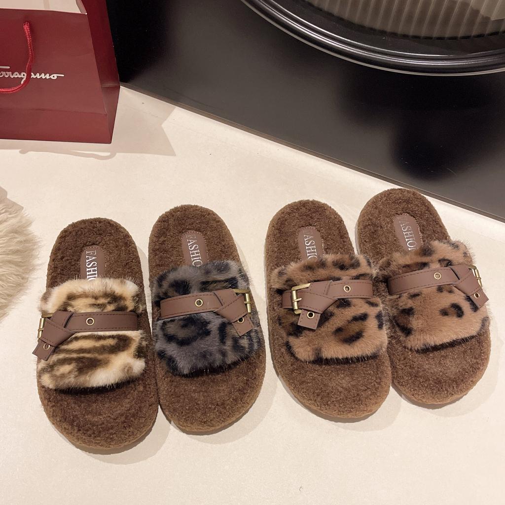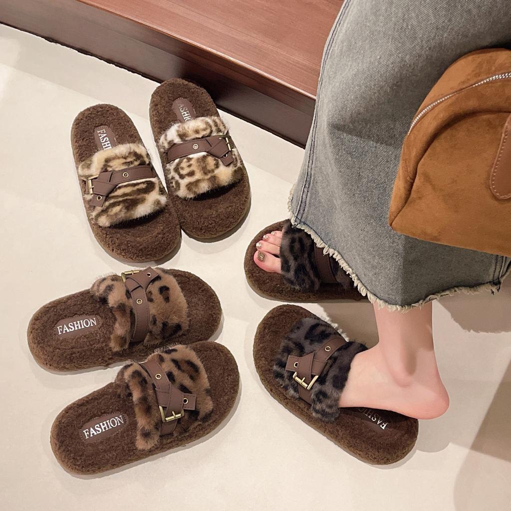 2025 осень и зима новые корейская версия модные пушистые тапочки женские носить толстая подошва пряжка леопардовый принт хлопковые тапочки женские