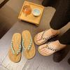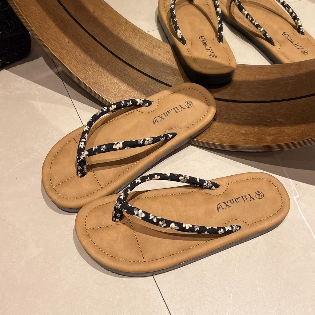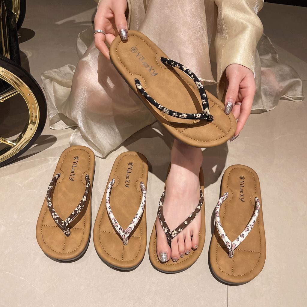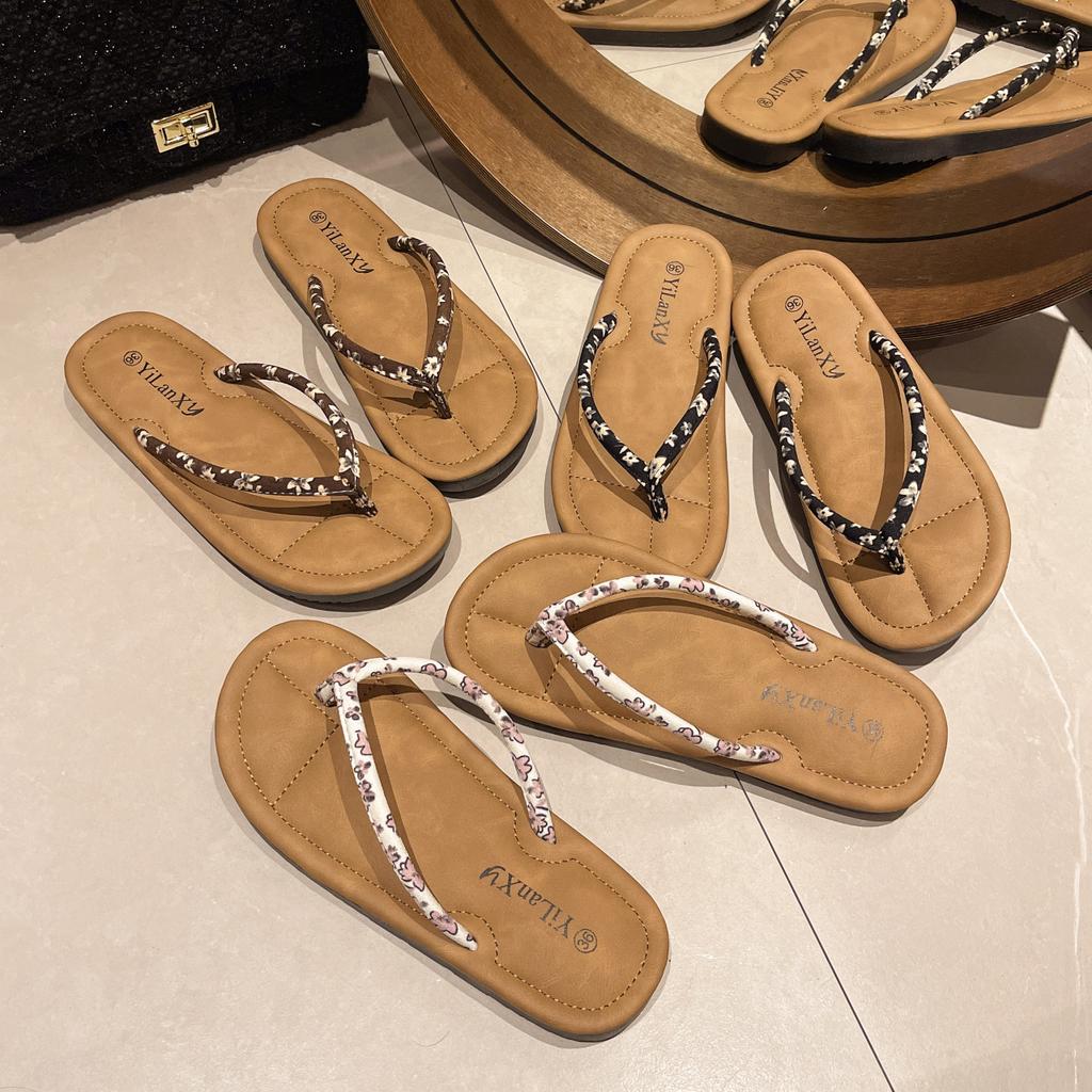 Flat bottom pinch beach slippers women's 2025 summer wear new fashionable small floral herringbone cool slippers foreign trade large size