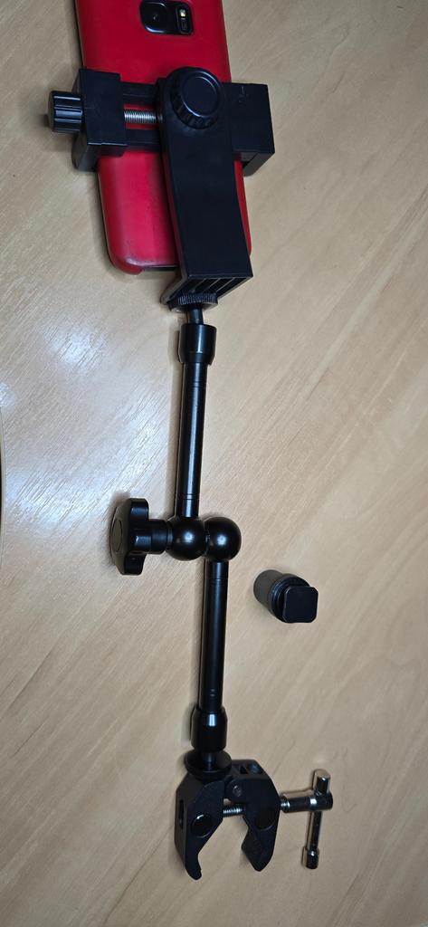 Стойка отличная. Крепёж под телефон у меня уже был - просто прикрутил его к стойке. 3 сустава затягиваются одним винтом и это очень удобно. Держит надёжно, хотя нижняя лапа могла бы быть другой формы. Она больше для трубы, чем для столешницы. Приходится давить сильнее, чтоб не скользить, а это износ