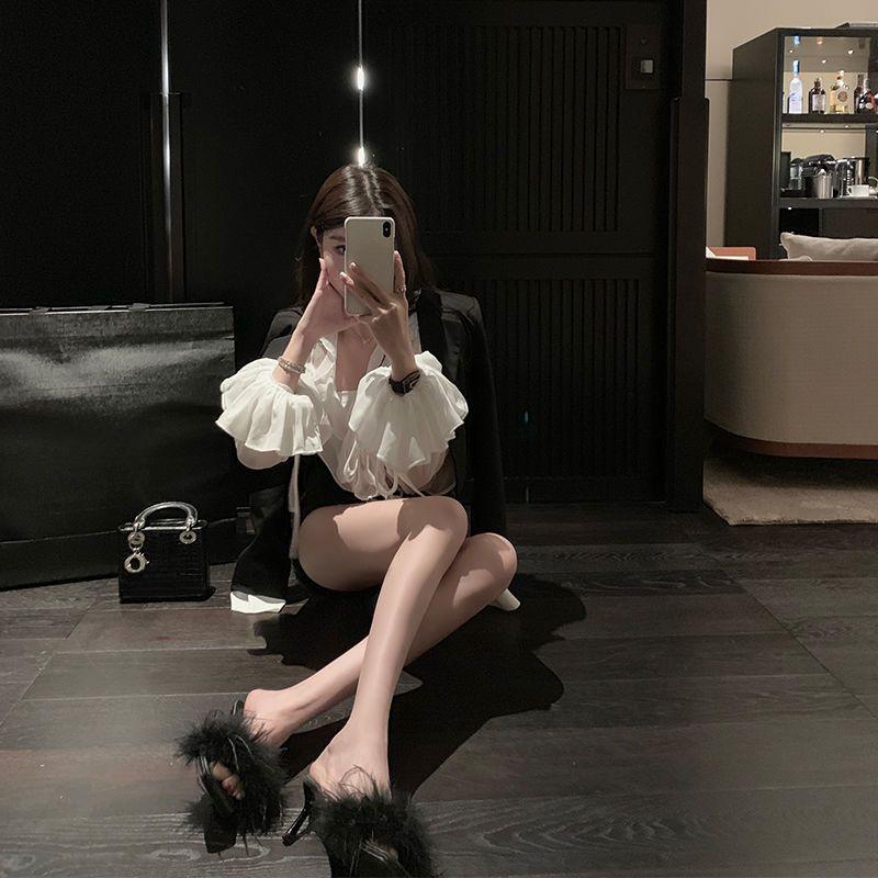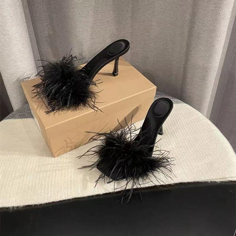Женские тапочки и босоножки женские черные шлепанцы винтажные туфли с перьями на каблуке лето 2024 пушистая свадьба сексуальные пушистые уникальные Eva I