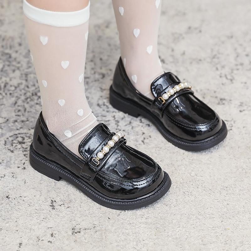 Кожаные туфли для девочек на школьную вечеринку, свадьбу, детские черные мокасины, без застежек, детская обувь на плоской подошве, модные туфли в британском стиле с жемчугом и бусинами, новые