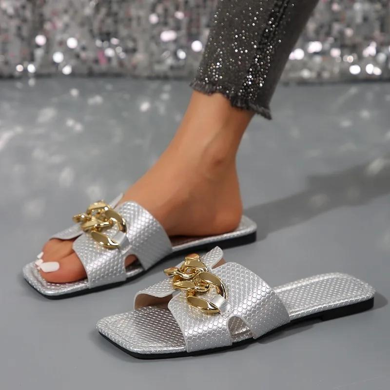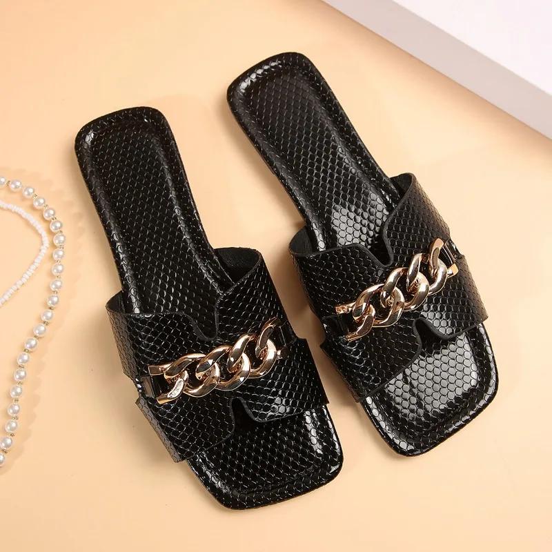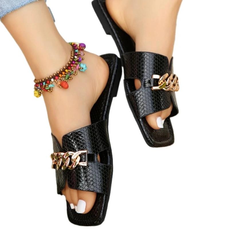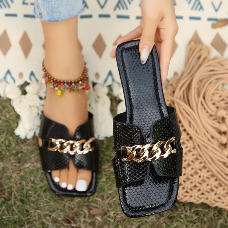 2024 Горячая Распродажа Туфли для женщин Базовые женские тапочки Летние повседневные тапочки женские цепочка квадратный носок плоские с обувью для отдыха на природе для женщин