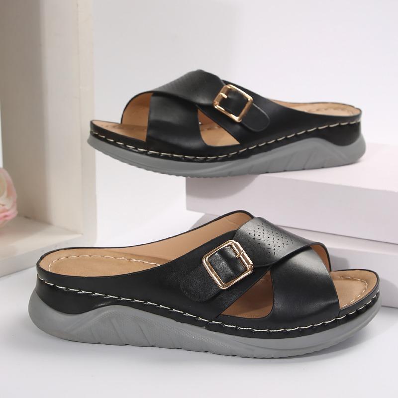 Летние кожаные тапочки на танкетке для женщин 2024 г. Новые модные сандалии с пряжкой на толстой подошве для женщин Удобные нескользящие пляжные