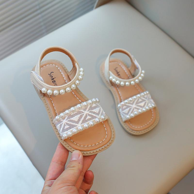 Сандалии для девочек, детская летняя обувь, детские пляжные сандалии с жемчугом, милые нескользящие принцессы с открытым носком, шикарные кружевные сандалии с бисером