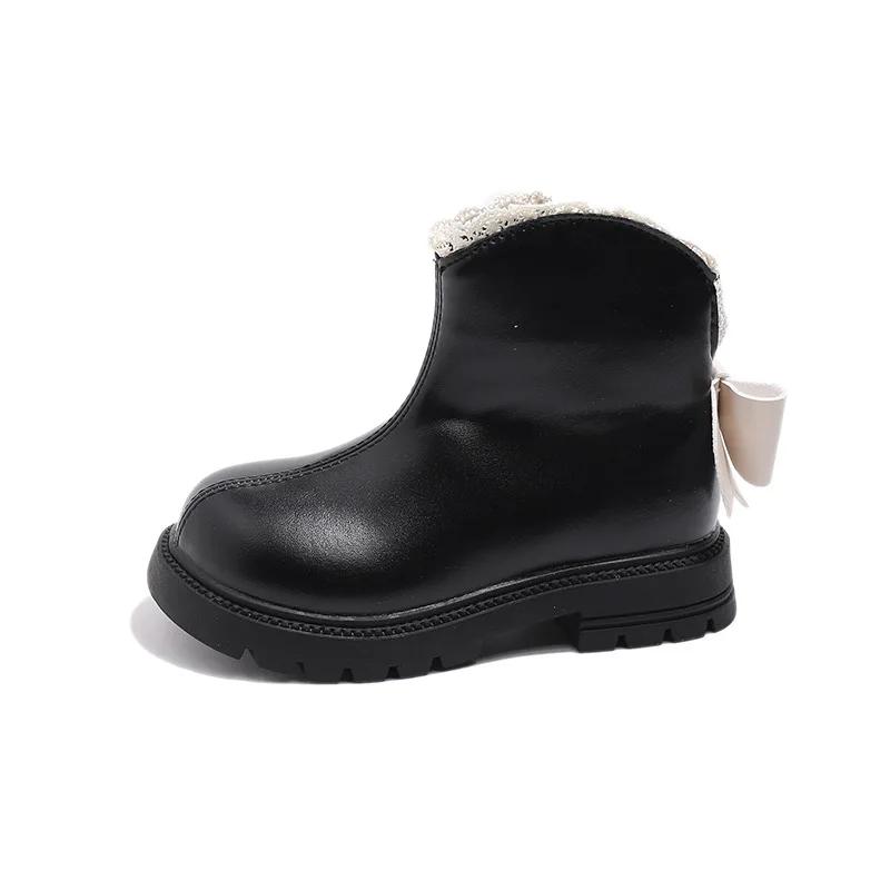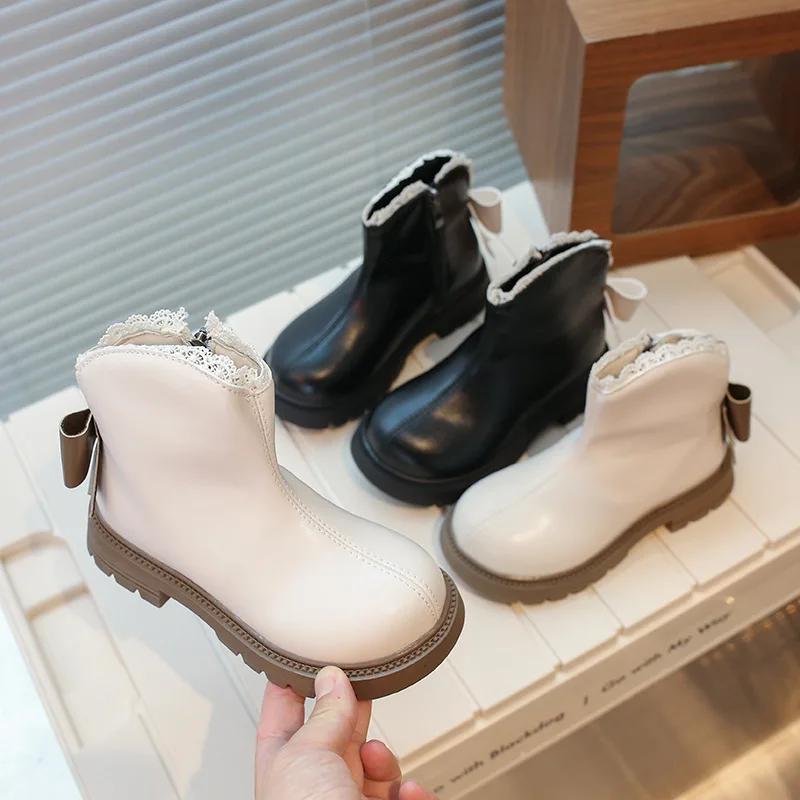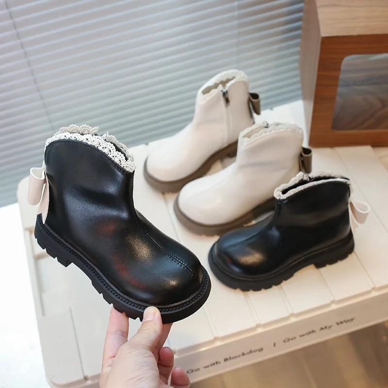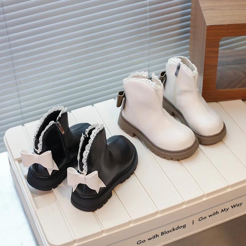 2024 Детские короткие ботинки для девочек, осень, новая мода, британский стиль, милая бабочка, элегантные кружевные принцессы, универсальные кожаные туфли