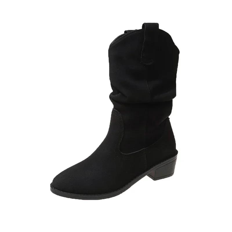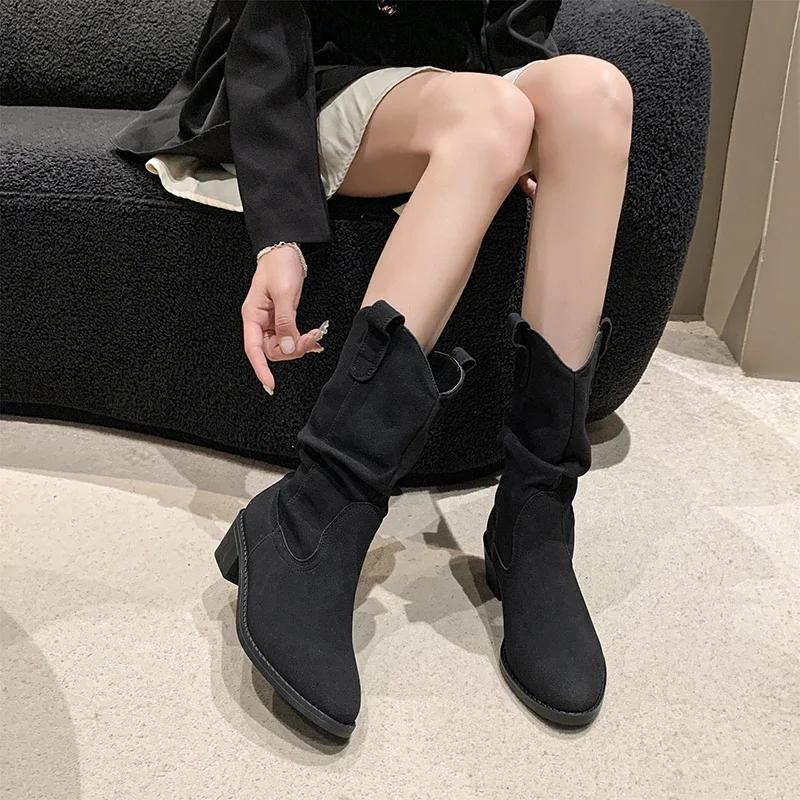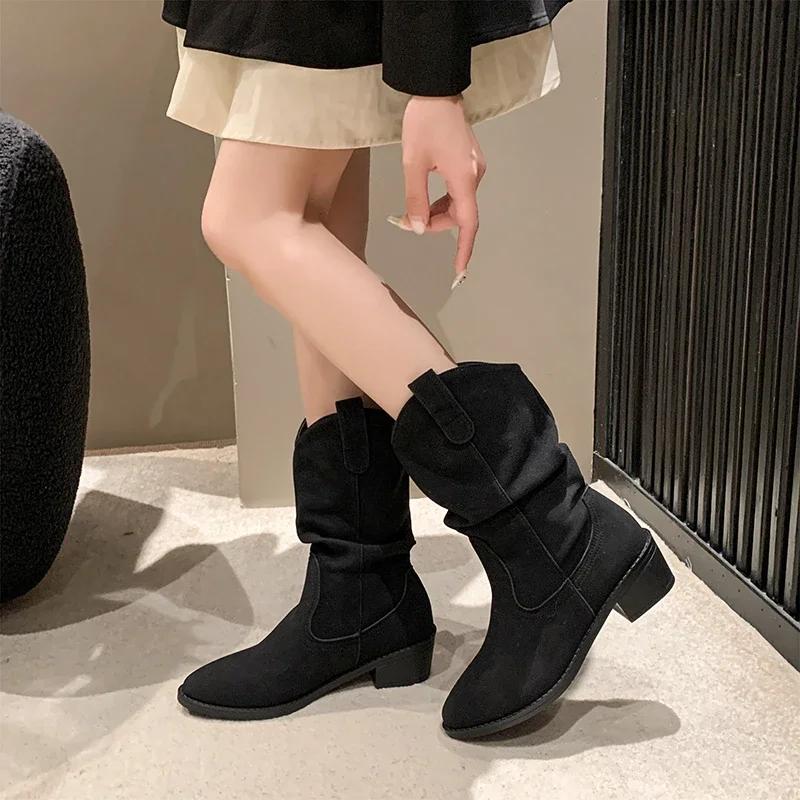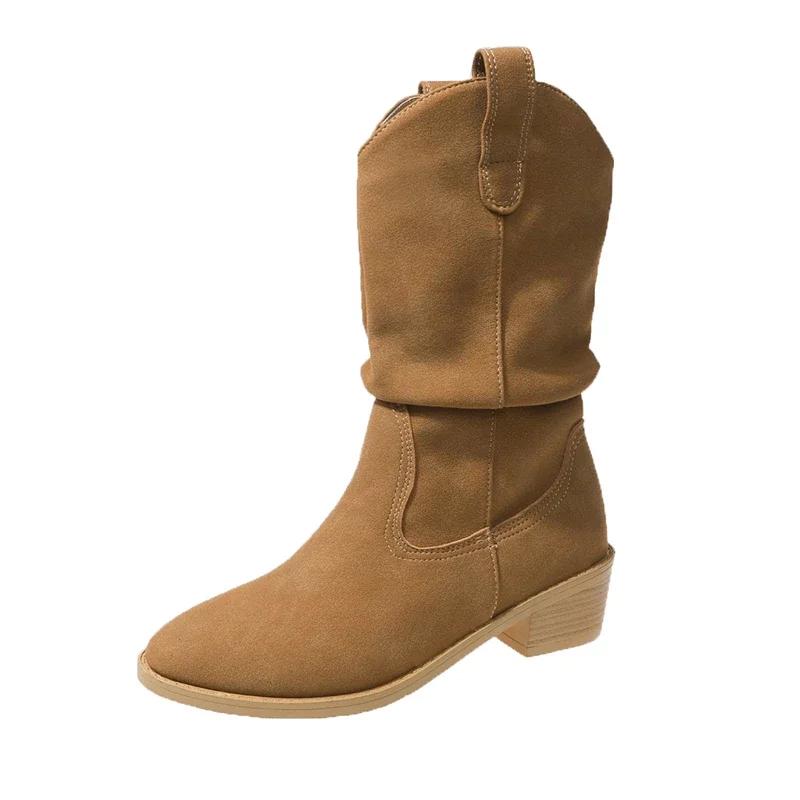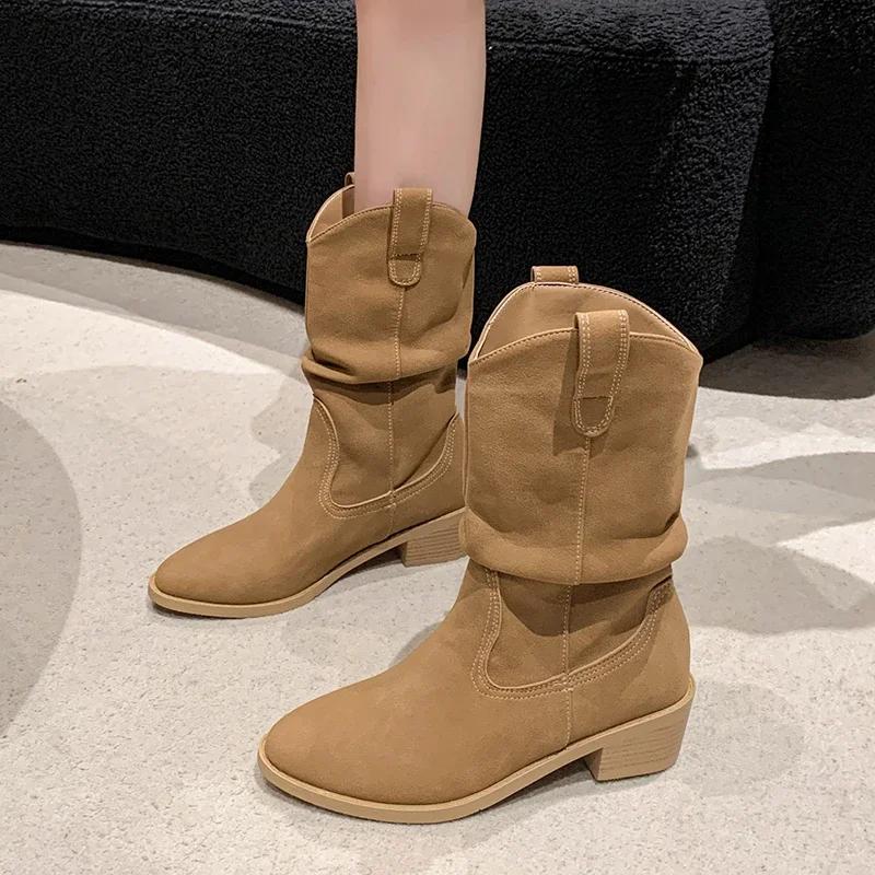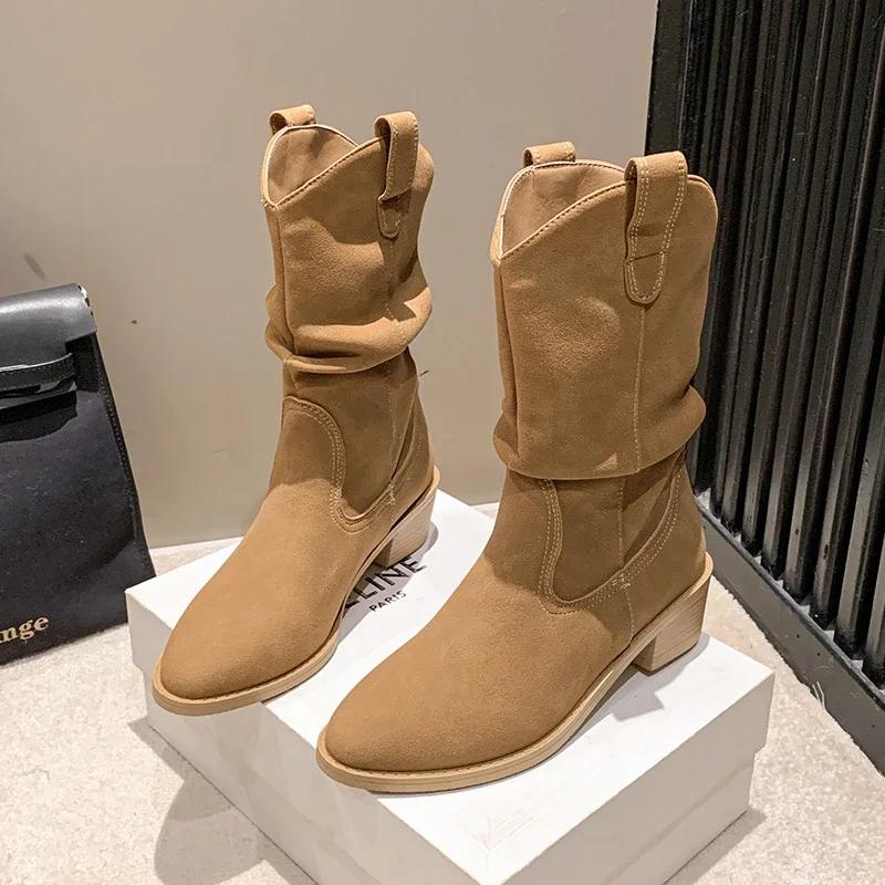 2024 Модные кожаные женские сапоги в стиле вестерн со складками, остроносые сапоги до середины голени, женские замшевые туфли телесного цвета без застежек, винтажная женская обувь