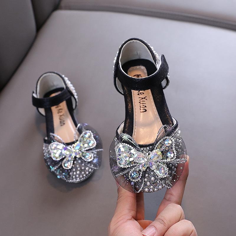 Новые роскошные туфли для девочек, элегантные детские сандалии с бабочками и жемчугом, модные универсальные туфли для свадебной вечеринки на плоской подошве для детей, повседневные туфли с нескользящей подошвой