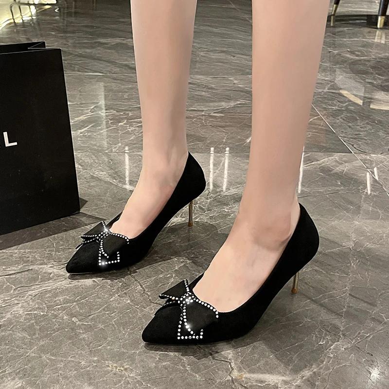 2024 Весна и осень Новые женские туфли с неглубоким носком, банты, стразы, сексуальные свадебные туфли на шпильках, высокие каблуки, однотонные