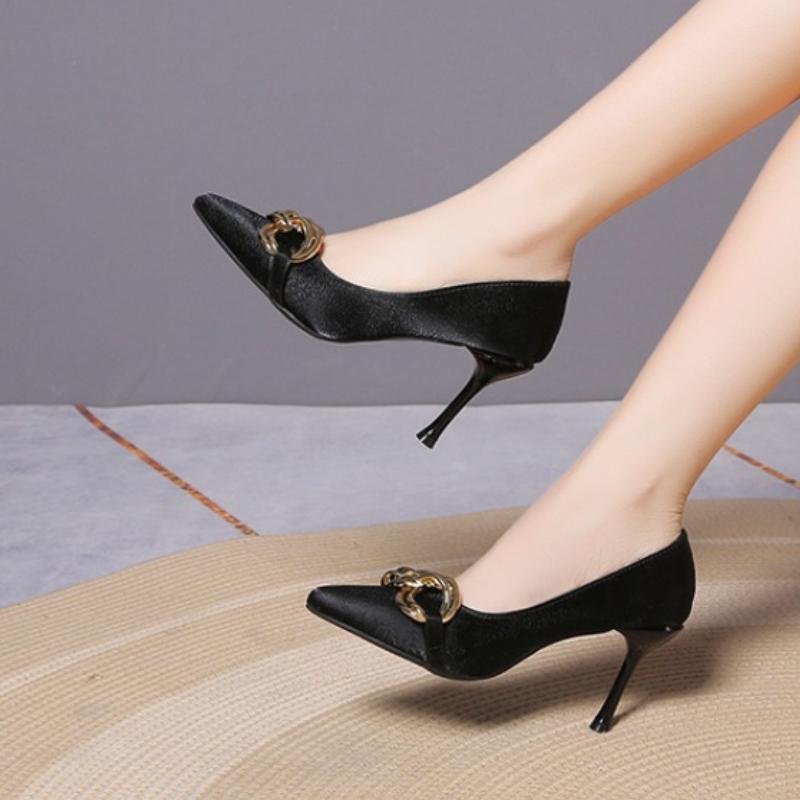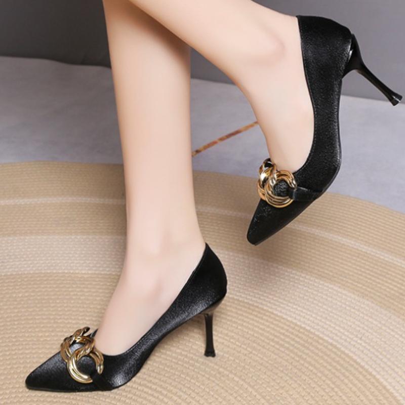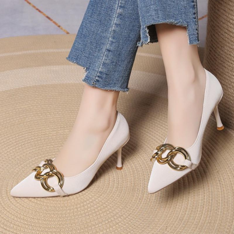 2024 Весна и осень Модные однотонные туфли на высоком каблуке с неглубоким носком и металлическим украшением
