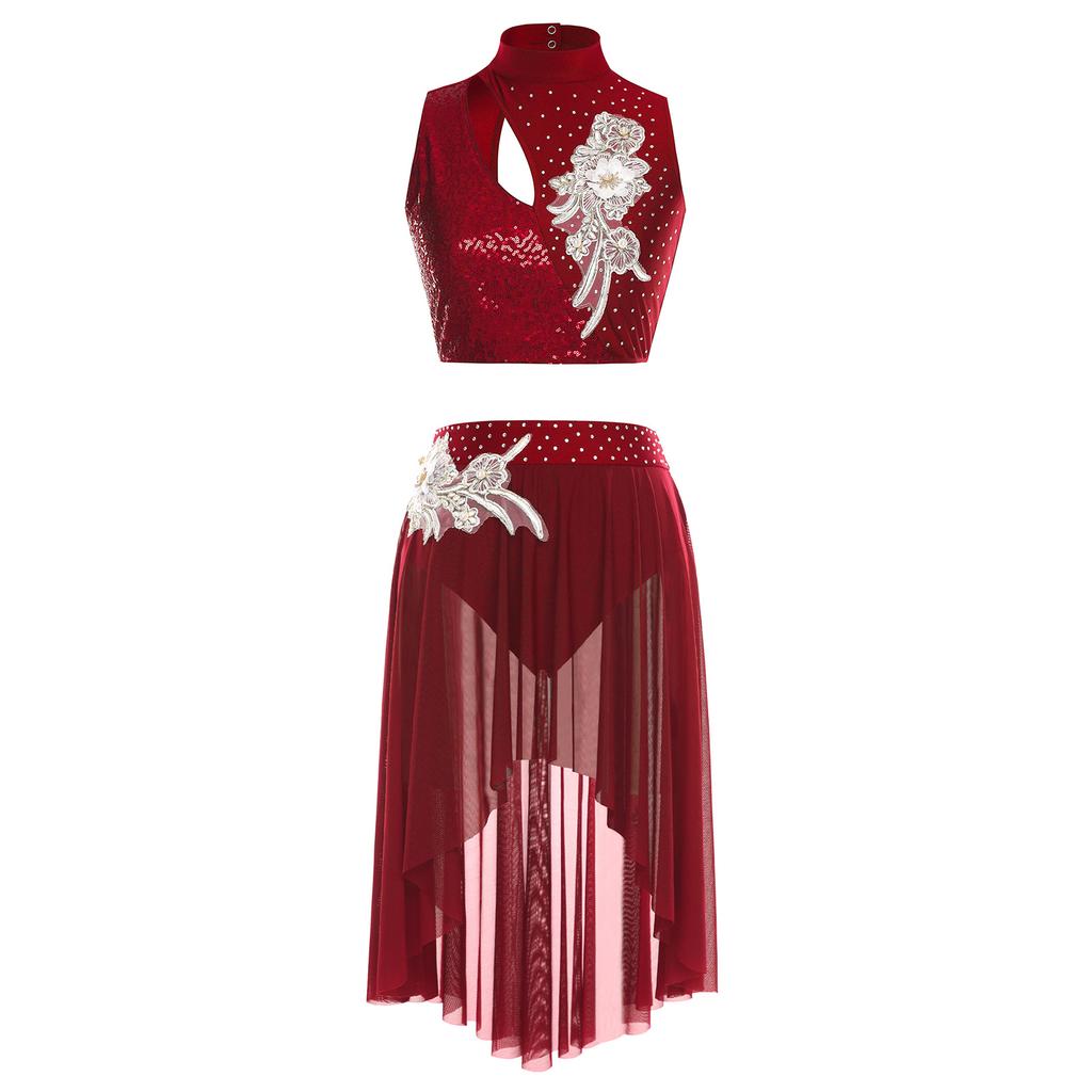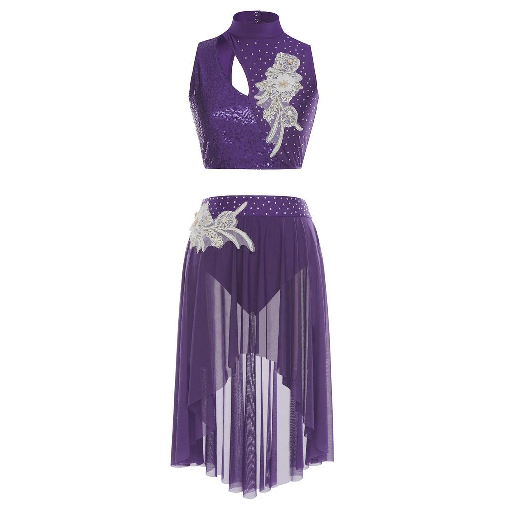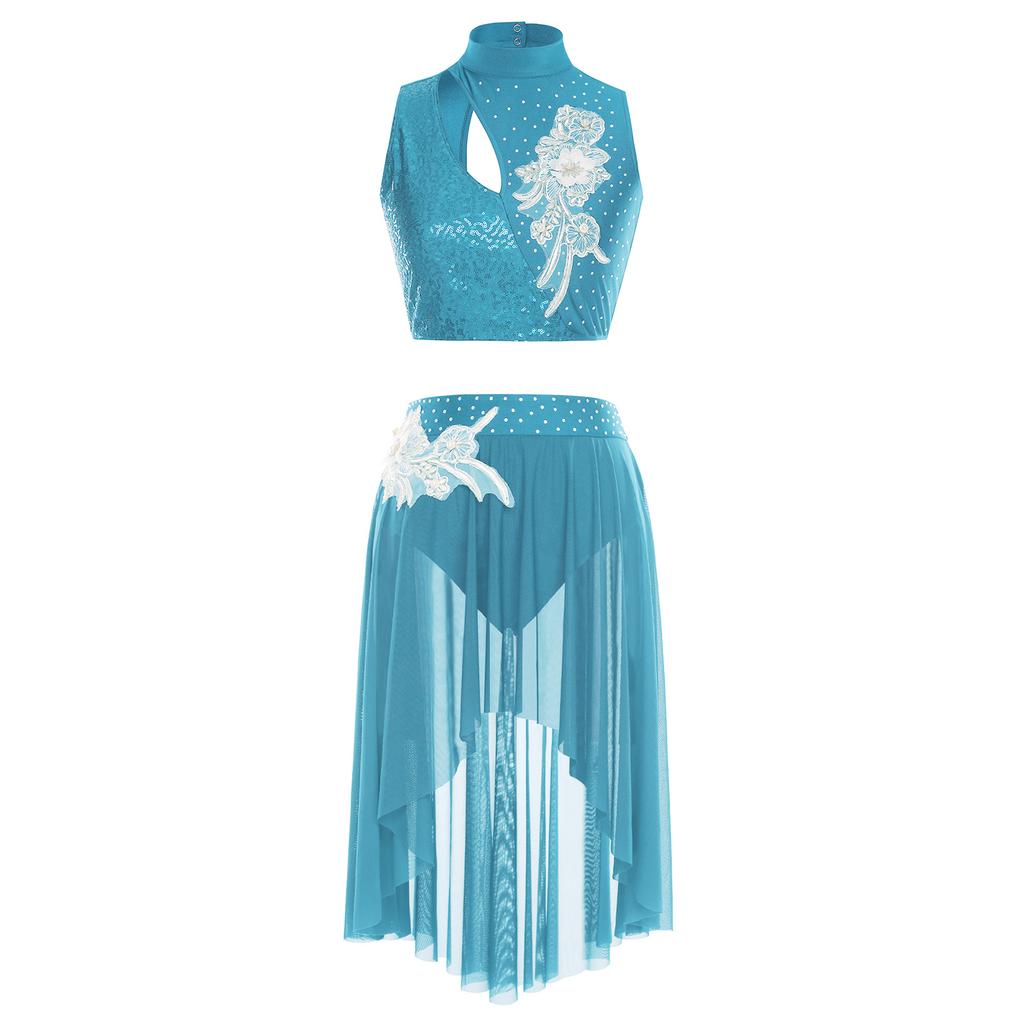 Женские костюмы для лирического танца, без рукавов, с вырезами, кроп-топ, юбка с неровным сетчатым подолом, трусы, аппликации, комплект танцевальной одежды