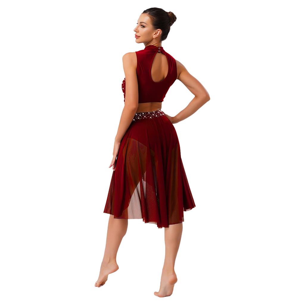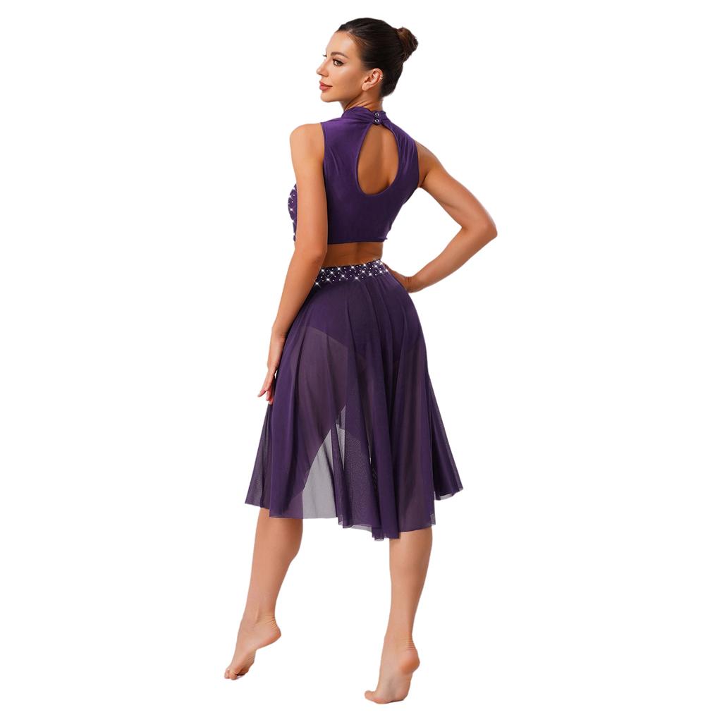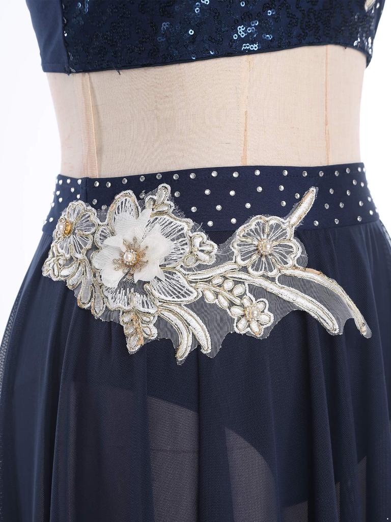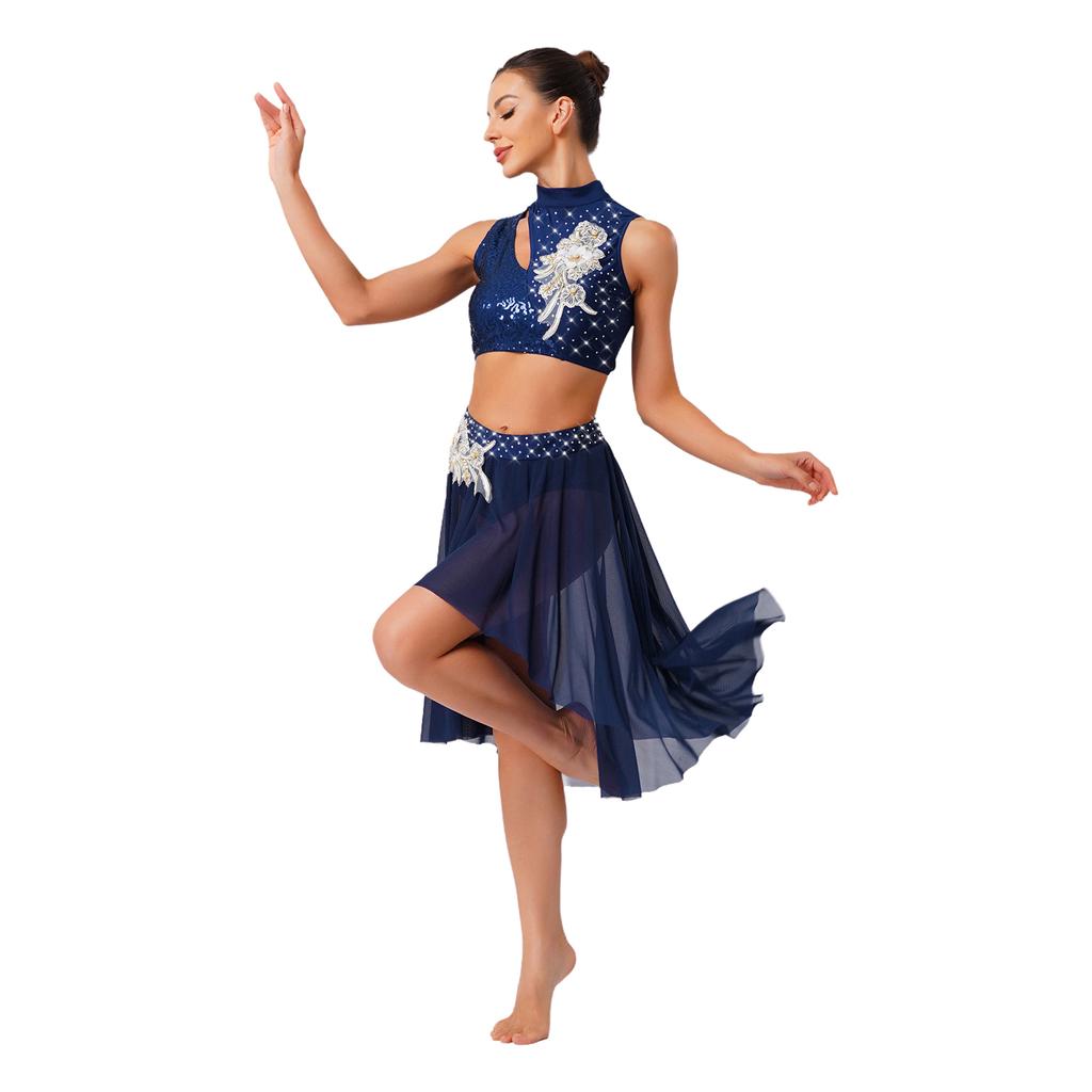 Женские костюмы для лирического танца, без рукавов, с вырезами, кроп-топ, юбка с неровным сетчатым подолом, трусы, аппликации, комплект танцевальной одежды