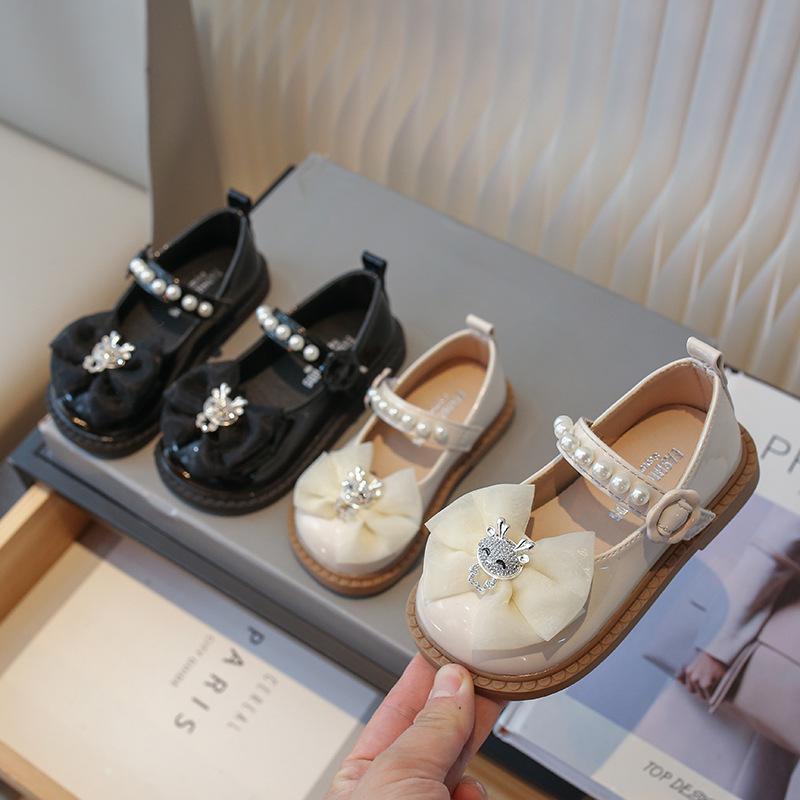 Новые туфли принцессы из кожи для девочек, милые детские туфли на плоской подошве с кружевом и бантом, модные весенне-осенние детские универсальные блестящие туфли Мэри Джейн