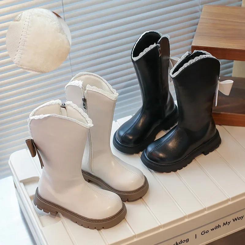 2024 Детские модные высокие сапоги для девочек, зимние новые корейские стильные милые бабочки, мягкая подошва, нескользящая универсальная кожаная обувь