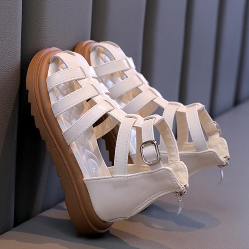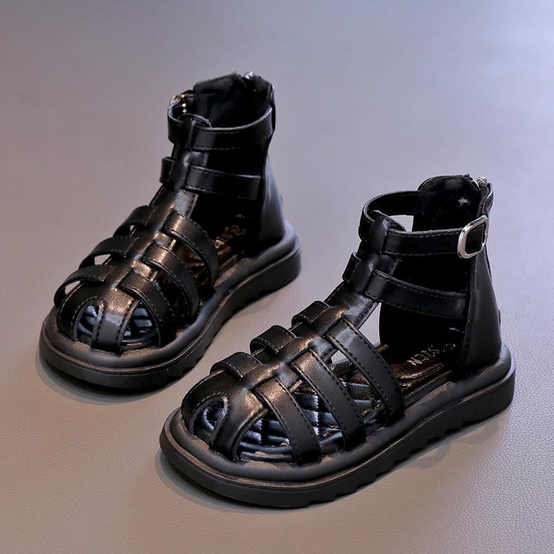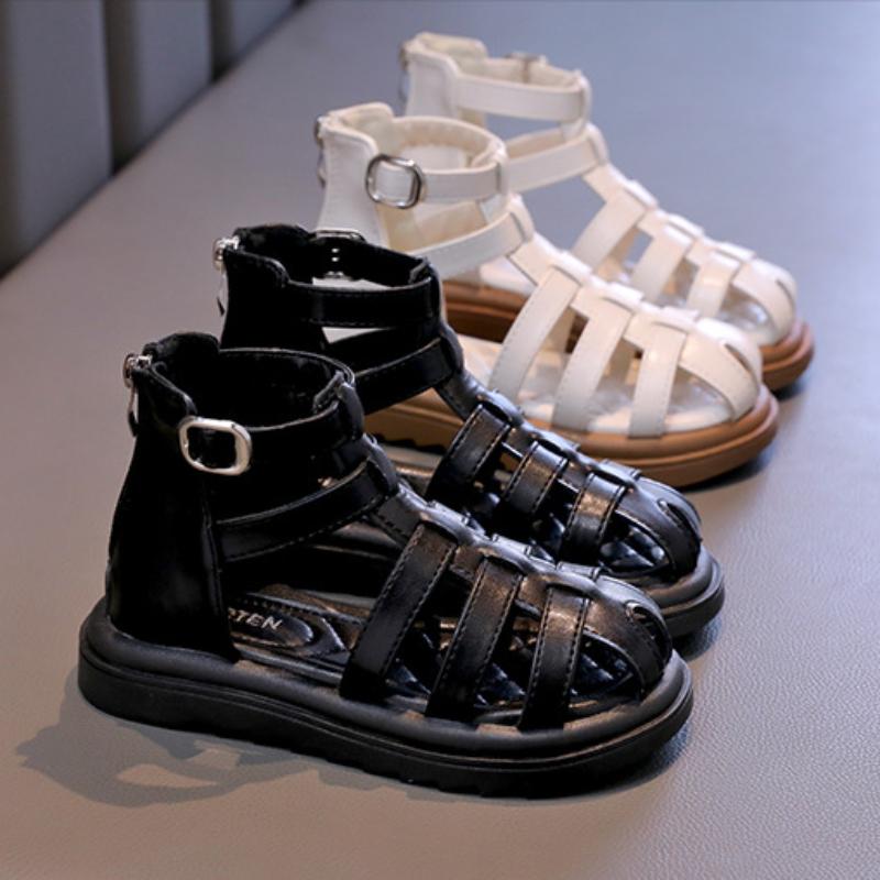 Детские сандалии в британском стиле для девочек, летняя детская обувь 2024 года с открытыми плечами, модные повседневные простые римские сандалии для девочек с высоким берцем