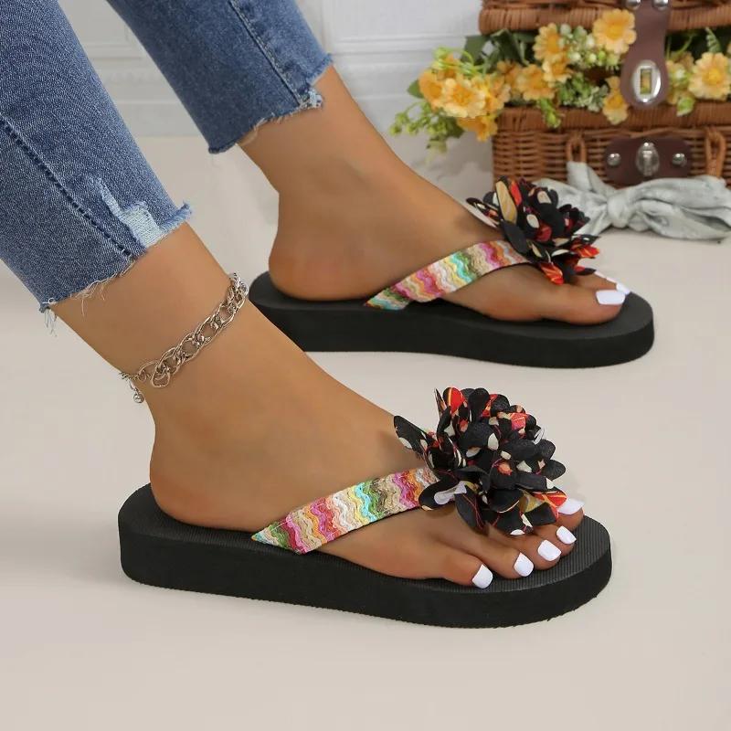 2024 Летние женские тапочки, новые модные женские туфли на плоской подошве с открытым носком, повседневные пляжные туфли с цветочным узором
