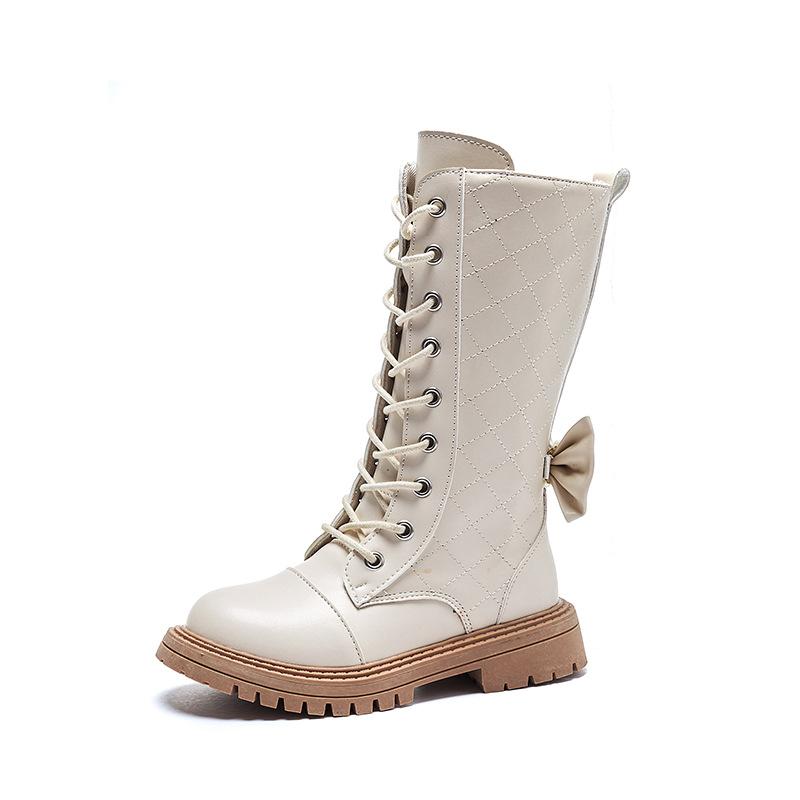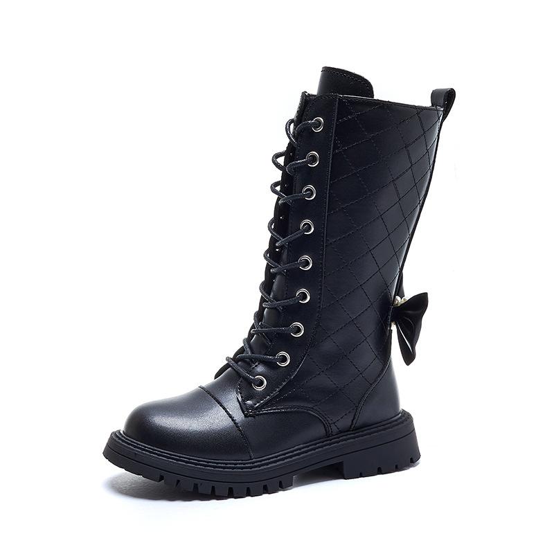 Высокие сапоги для девочек в британском стиле 2024 года, новые универсальные осенне-зимние детские сапоги с мягкой подошвой, милые простые нескользящие сапоги принцессы с бантом сзади