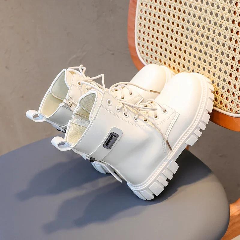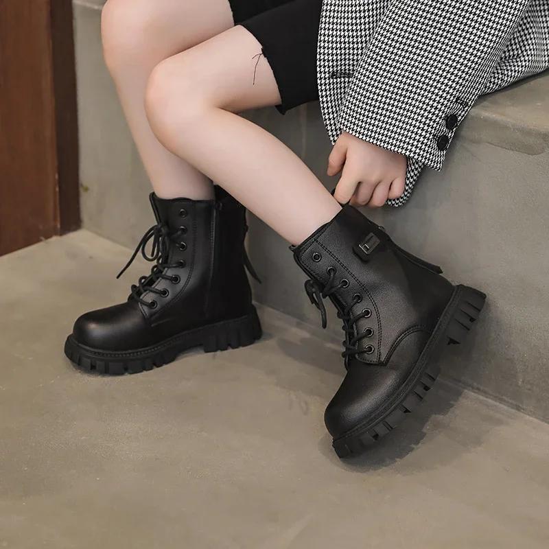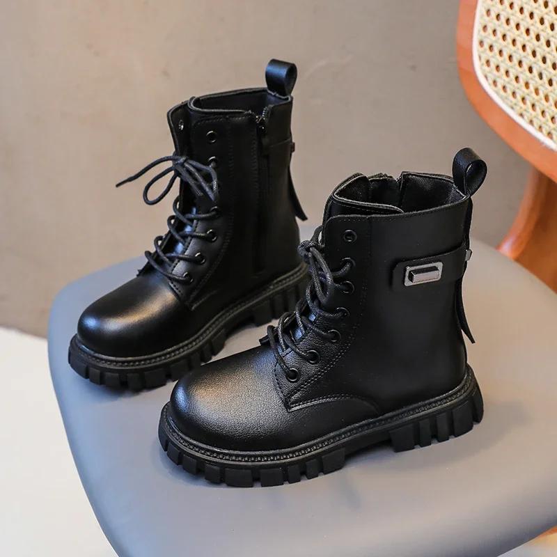 Модные ботинки для девочек, детские черные ботинки в стиле мотоцикла Tide, резиновые ботинки для детей в британском стиле 2024 года, теплые, с металлической пряжкой