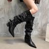 Массивные женские высокие сапоги из кожи с острым носком на среднем каблуке, модные дизайнерские туфли-лодочки с пряжкой 2025 года, готические зимние ботинки длиной до колена