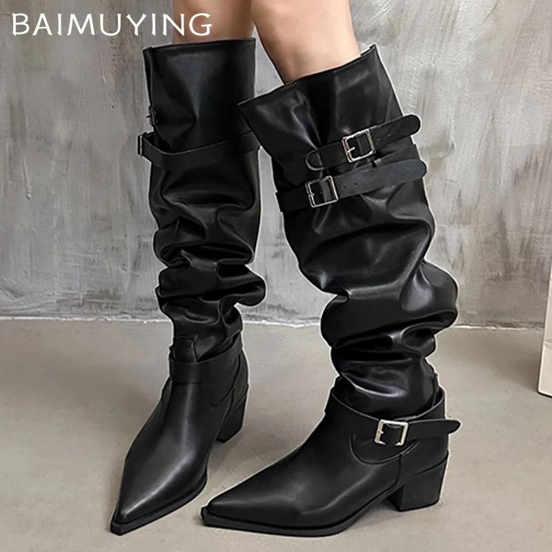 Массивные женские высокие сапоги из кожи с острым носком на среднем каблуке, модные дизайнерские туфли-лодочки с пряжкой 2025 года, готические зимние ботинки длиной до колена — купить товар онлайн с бесплатной доставкой по всему миру!